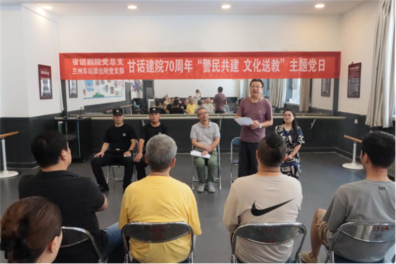 為慶祝甘肅省話劇院建院70周年,甘肅演藝集團(tuán)話劇院(甘肅兒童劇院)策劃創(chuàng)排《薪火相傳七十年》紀(jì)念演出活動,回顧甘話70年的發(fā)展歷程和崢嶸歲月。為向在排練中辛勤付出的老黨員、老藝術(shù)家們致敬和為全力以赴積極工作在一線的演職人員們鼓勁加油,增強(qiáng)干部職工的凝聚力、向心力,以黨建為引領(lǐng),發(fā)揚高度的主人翁精神, 8月3日,甘肅演藝集團(tuán)話劇院(甘肅兒童劇院)黨總支和蘭州車站派出所黨支部聯(lián)合開展甘話建院70周年“警民共建 文化送教”主題黨日活動。