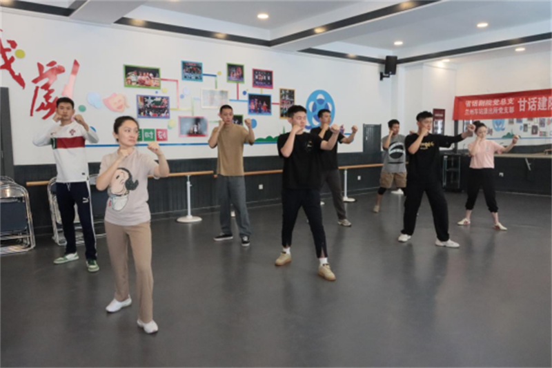 主題黨日活動中,授課教官一絲不茍,認(rèn)真施教,全體演職人員精神振作,士氣高昂,整齊劃一,氣氛熱烈。教官授課內(nèi)容切合實際,深入淺出,通俗易懂,全體參訓(xùn)演職人員認(rèn)真聽講,反復(fù)練習(xí)所學(xué)動作,努力掌握每一個動作要領(lǐng),確保了訓(xùn)練的實效性。同時,還邀請?zhí)m州車站派出所民警現(xiàn)場觀看了紀(jì)念回顧展演話劇片段的排演。