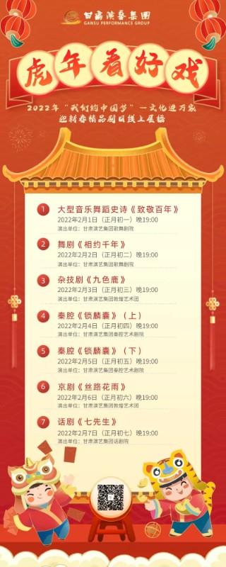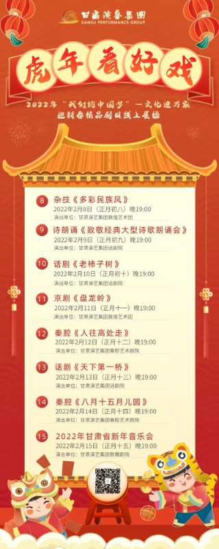 為深入貫徹落實習近平總書記在文聯(lián)十一大、作協(xié)十大開幕式上的重要講話精神,助力文化強省建設(shè),進一步滿足廣大群眾精神文化需求,增加春節(jié)節(jié)日氣氛,由中共甘肅省委宣傳部、甘肅省文化和旅游廳主辦,甘肅演藝集團承辦,甘肅新媒體集團、蘭州黃河風情線大景區(qū)管理委員會協(xié)辦,按照省、市疫情防控要求,現(xiàn)場將對觀眾掃碼、測溫并實行一米間隔。從正月初二開始在城關(guān)區(qū)近水廣場開展持續(xù)5天的5場戶外演出并進行網(wǎng)絡(luò)直播。另外,甘肅演藝集團聯(lián)合新甘肅客戶端、每日甘肅網(wǎng)、甘肅演藝集團視頻號等多個網(wǎng)絡(luò)平臺,在2022年2月1日至15日(正月初一至十五)期間,精心挑選了近年來創(chuàng)排的15部精品劇目進行網(wǎng)絡(luò)展演。