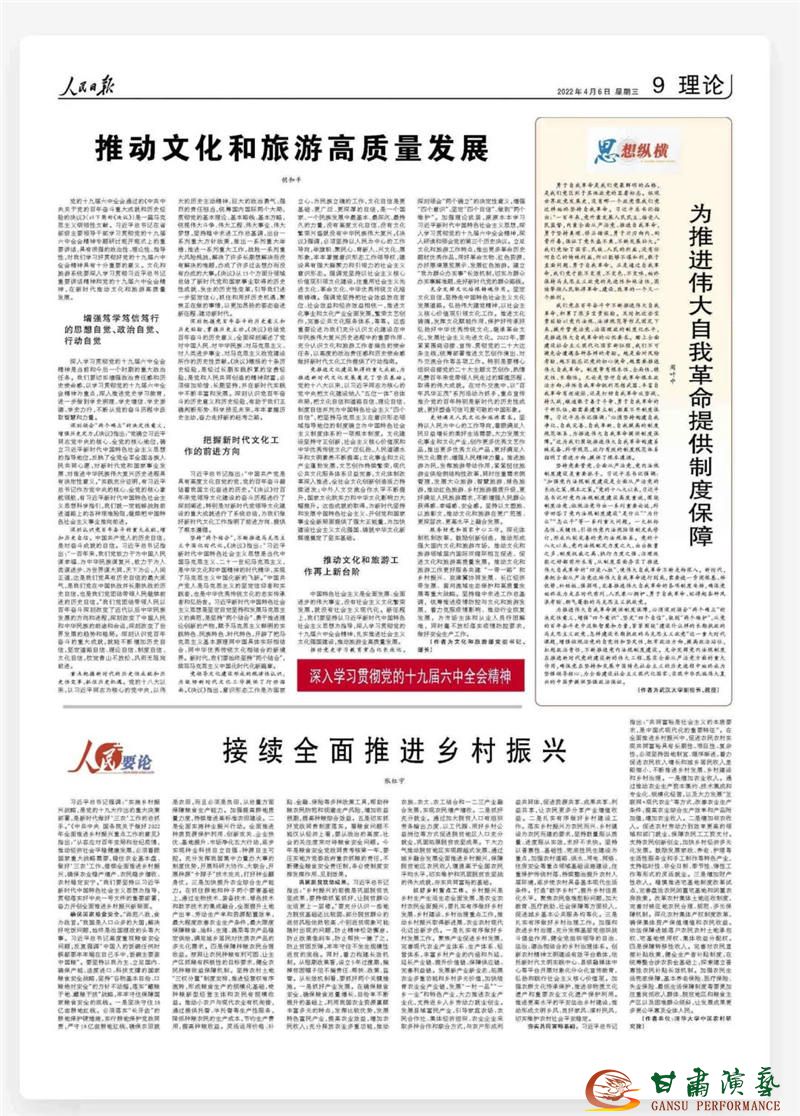 黨的十九屆六中全會通過的《中共中央關(guān)于黨的百年奮斗重大成就和歷史經(jīng)驗(yàn)的決議》(以下簡稱《決議》)是一篇馬克思主義綱領(lǐng)性文獻(xiàn)。習(xí)近平總書記在省部級主要領(lǐng)導(dǎo)干部學(xué)習(xí)貫徹黨的十九屆六中全會精神專題研討班開班式上的重要講話,具有很強(qiáng)的政治性、理論性、指導(dǎo)性,對我們學(xué)習(xí)好貫徹好黨的十九屆六中全會精神具有十分重要的意義。文化和旅游系統(tǒng)要深入學(xué)習(xí)貫徹習(xí)近平總書記重要講話精神和黨的十九屆六中全會精神,在新時代推動文化和旅游高質(zhì)量發(fā)展。