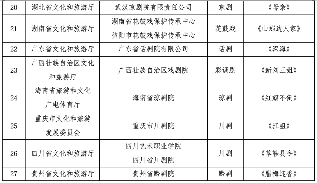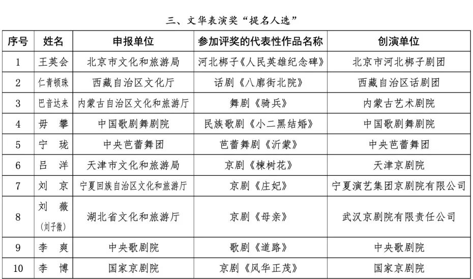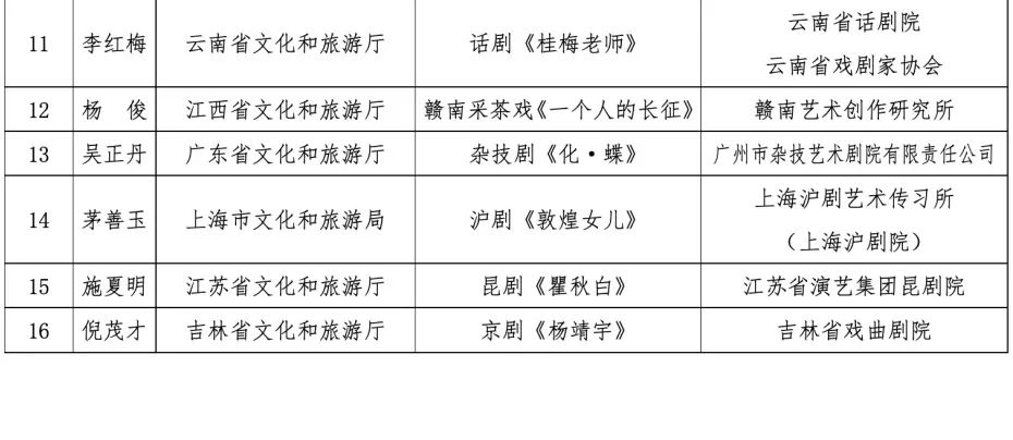 根據(jù)《中國(guó)文化藝術(shù)政府獎(jiǎng)——文華獎(jiǎng)?wù)鲁獭贰吨袊?guó)文化藝術(shù)政府獎(jiǎng)——第十七屆文華獎(jiǎng)評(píng)獎(jiǎng)辦法》有關(guān)規(guī)定,現(xiàn)將第十七屆文華大獎(jiǎng)終評(píng)作品名單和第十七屆文華編劇獎(jiǎng)、文華導(dǎo)演獎(jiǎng)、文華表演獎(jiǎng)“提名人選”名單予以公示(第十七屆文華音樂創(chuàng)作獎(jiǎng)、文華舞臺(tái)美術(shù)獎(jiǎng)無“提名人選”)。入圍終評(píng)的作品和“提名人選”所對(duì)應(yīng)的作品應(yīng)參加第十三屆中國(guó)藝術(shù)節(jié)現(xiàn)場(chǎng)演出,不能參加者視為自動(dòng)放棄評(píng)獎(jiǎng)資格。