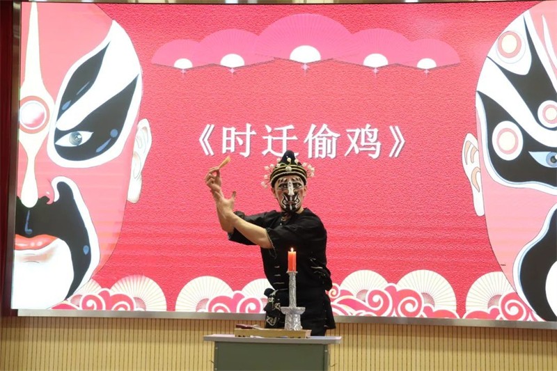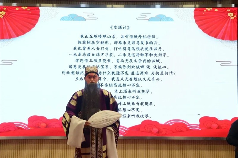 授牌儀式后敦煌藝術(shù)團(tuán)進(jìn)行了京劇表演,演出在韻味十足的京劇曲牌《夜深沉》中拉開了序幕。字正腔圓的現(xiàn)代京劇《紅燈記》選段、聲情并茂的傳統(tǒng)京劇《空城計(jì)》、惟妙惟肖的《賣水》、《石遷偷雞》跌宕起伏的劇情將現(xiàn)場(chǎng)氣氛推向高潮。舞臺(tái)上寬袍水袖,絲竹管弦,深深吸引了同學(xué)們的眼球,同學(xué)們情緒高漲,觀看得津津有味,贏得了雷鳴般的掌聲。