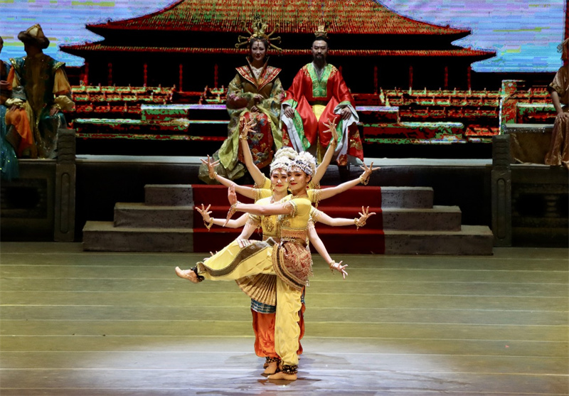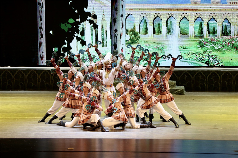 此舞只應(yīng)天上有,人間難得看幾回。舞劇《絲路花雨》以舉世聞名的敦煌壁畫和絲綢之路為題材,以和平、友誼為主題,通過(guò)敦煌畫工“神筆張”和女兒“英娘”與波斯商人“依努斯”患難與共、生死相交的故事,以別具一格的藝術(shù)風(fēng)格,將瑰麗多彩的敦煌壁畫搬上舞臺(tái),藝術(shù)再現(xiàn)了敦煌文化的博大精深,贊美了勞動(dòng)人民創(chuàng)造敦煌文化的光輝形象。舞劇博采“一帶一路”沿線國(guó)家和地區(qū)民間歌舞,融合了中國(guó)古典舞、印度舞、黑巾舞、波斯馬鈴舞、波斯酒舞、土耳其舞、盤上舞、新疆舞等舞蹈藝術(shù)形式。經(jīng)典的敦煌舞姿,優(yōu)美的莫高畫卷,給現(xiàn)場(chǎng)觀眾留下了美好的印象。掌聲無(wú)數(shù)次響起,“太精彩了”“太震撼人心”的由衷感嘆在不同年齡段的觀眾口中一次次重復(fù)著。