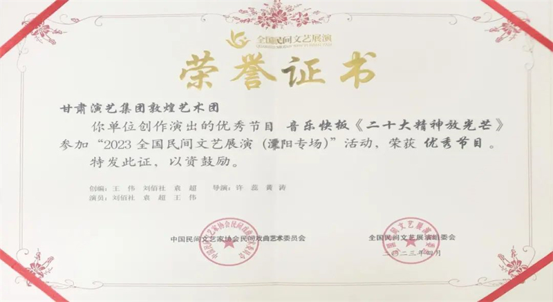 2023年4月20日至23日,全國民間文藝展演(溧陽專場(chǎng))在江蘇省常州市溧陽文化藝術(shù)中心劇院舉辦。甘肅演藝集團(tuán)敦煌藝術(shù)團(tuán)曲藝作品音樂快板《二十大精神放光芒》受邀參加。作品充分展示了昂揚(yáng)向上的精神風(fēng)貌,展望前景,目標(biāo)超前,凝聚起“奮進(jìn)新征程,建功新時(shí)代”的磅礴力量,以實(shí)際行動(dòng)學(xué)習(xí)貫徹、宣傳黨的二十大。節(jié)目一登臺(tái),便引來現(xiàn)場(chǎng)觀眾們的聲聲叫好,并榮獲了此次“溧陽專場(chǎng)”活動(dòng)優(yōu)秀節(jié)目獎(jiǎng)。