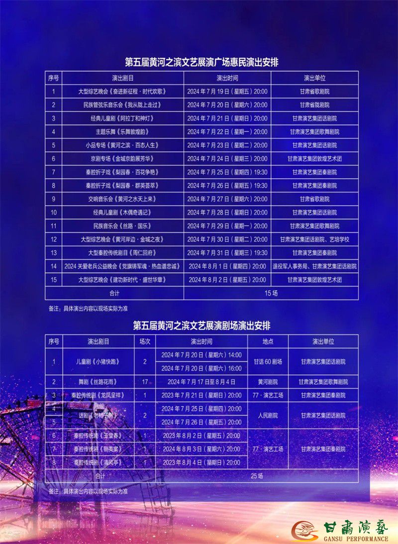 此次文藝展演將從7月19日持續(xù)至8月4日。展演期間,不僅在體育文化廣場(chǎng)安排了15場(chǎng)文化惠民演出,甘肅黃河劇院、人民劇院、甘話(huà)60劇場(chǎng)、77·演藝工場(chǎng)等也將作為分劇場(chǎng),共計(jì)演出40場(chǎng)。演出形式豐富多樣,涵蓋音樂(lè)會(huì)、兒童劇、舞劇、戲曲、曲藝、雜技、綜藝等多種藝術(shù)形式,滿(mǎn)足了不同觀(guān)眾的審美需求。