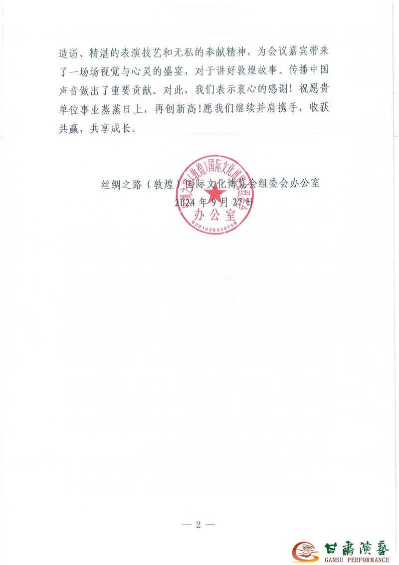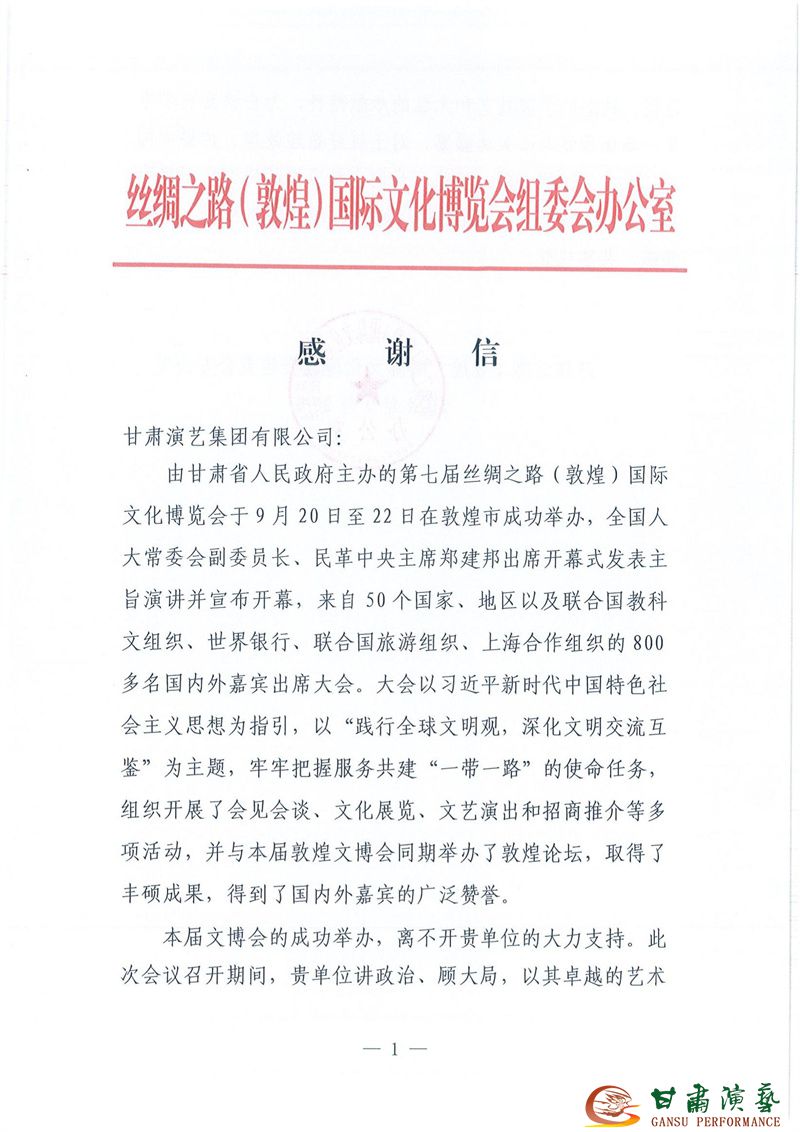 絲路之路(敦煌)國(guó)際文化博覽會(huì)組委發(fā)來(lái)感謝信