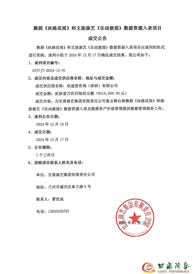 舞劇《絲路花雨》和文旅演藝《樂(lè)動(dòng)敦煌》數(shù)據(jù)資源入表項(xiàng)目成交公告