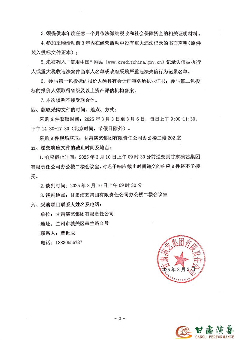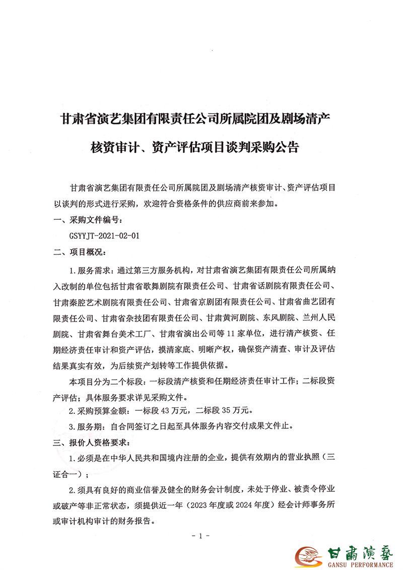 甘肅省演藝集團(tuán)有限責(zé)任公司所屬院團(tuán)及劇場(chǎng)清產(chǎn)核資審計(jì)、資產(chǎn)評(píng)估項(xiàng)目談判采購(gòu)公告