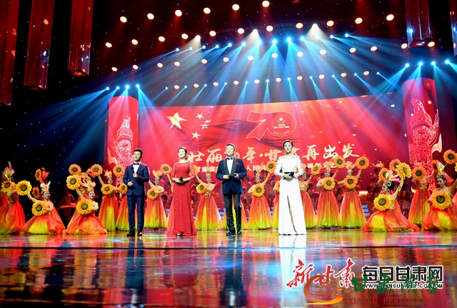 壯麗七十年,地覆天翻,唱不盡的頌歌,獻(xiàn)給映滿榮耀的神奇隴原;奮進(jìn)新時代,華彩蝶變,寫不完的祝福,獻(xiàn)給高質(zhì)量發(fā)展的炫彩隴原。整場演出綜合運(yùn)用音樂、舞蹈、配樂詩朗誦、情景表演、戲曲聯(lián)唱等舞臺手段,氣勢恢宏、震撼感人,贏得全場觀眾熱烈掌聲。