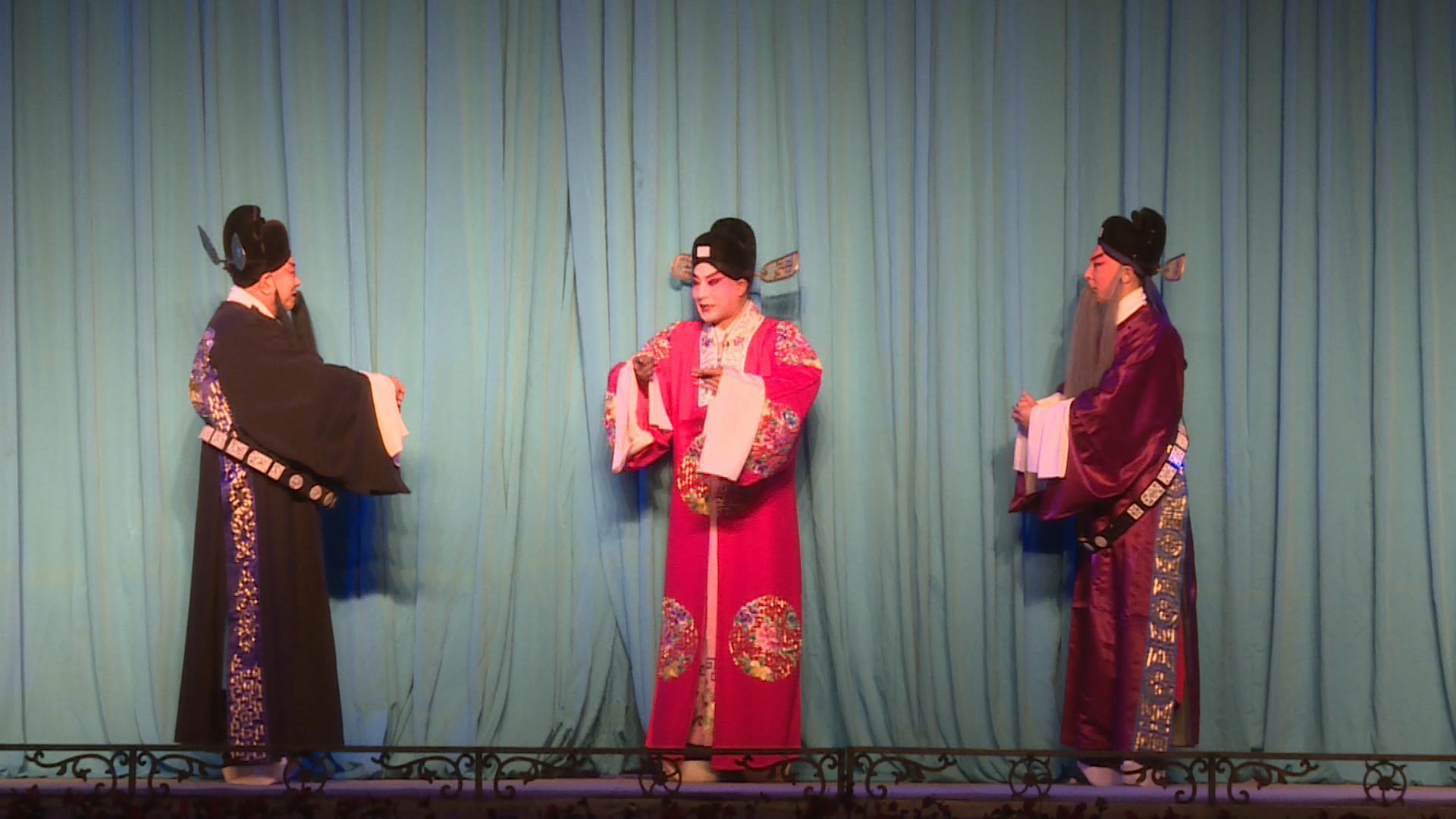 夜場(chǎng)演出的是秦腔傳統(tǒng)戲《玉堂春》,該劇主要講述了明代禮部尚書的三公子王景龍,與京城煙花名妓蘇三有情,因落難得蘇三贈(zèng)銀上京應(yīng)試,隨后蘇三蒙冤被定死罪,王景龍應(yīng)試高中八府巡按,調(diào)玉堂春一案復(fù)審,冤案始明,蘇三與王景龍遂得團(tuán)圓。其中《蘇三起解》《三堂會(huì)審》常單折演出,廣為流行。演出中,甘肅演藝集團(tuán)秦腔藝術(shù)劇院的藝術(shù)家們紛紛拿出自己的看家本領(lǐng)登臺(tái)演出,讓鄉(xiāng)親們?cè)诩议T口就能欣賞到高水平的文藝演出,過足戲癮,同時(shí),在濃厚的傳統(tǒng)文化氛圍中陶冶性情、歡度國慶。