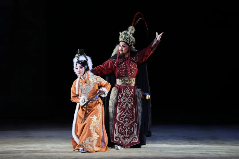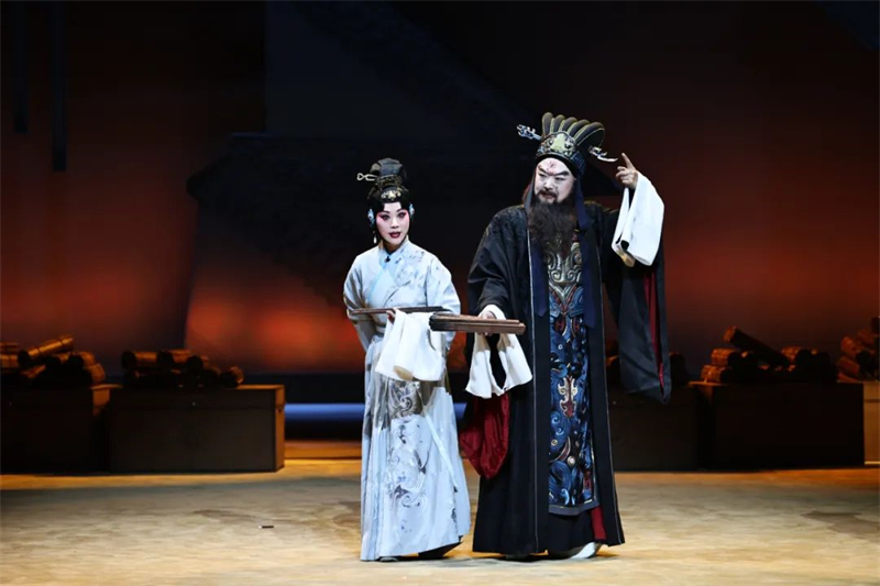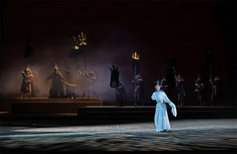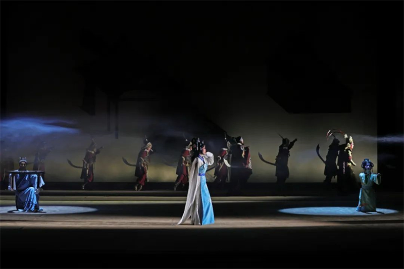 這出戲的文本敘事,一如其同題材作品,圍繞蔡文姬離漢與歸漢兩個關(guān)鍵脈絡而展開。其離漢,有文姬被擄,被妻的舞臺動作;而歸漢,則包含了離別、失憶、喪夫,乃至最后的“流離之魂,終有家園”,得以“勘定舊編,重修青簡”等一系列舞臺行動。顯然,劇作者張泓試圖將蔡文姬歸漢的心路歷程作為塑造其人物形象的重點,予以建構(gòu)和刻畫。編劇的這番用心,或許正是本劇在文學價值層面上有所成就的一個機緣。記得上世紀五十年代末的話劇《蔡文姬》創(chuàng)作,在毫不回避為曹操平反的動機下,左賢王的人物基調(diào)是參照公元前的冒頓單于而確立的,讓劇中的左賢王盡顯匈奴統(tǒng)帥的雄才大略。而上世紀九十年代,那幾出頗具影響的“文姬歸漢”劇目,其中的左賢王形象一股腦地變成舉止謙和的“暖男”,有的甚至圍著蔡文姬前后殷勤,就差對著觀眾打背躬,說這是為了民族和睦。