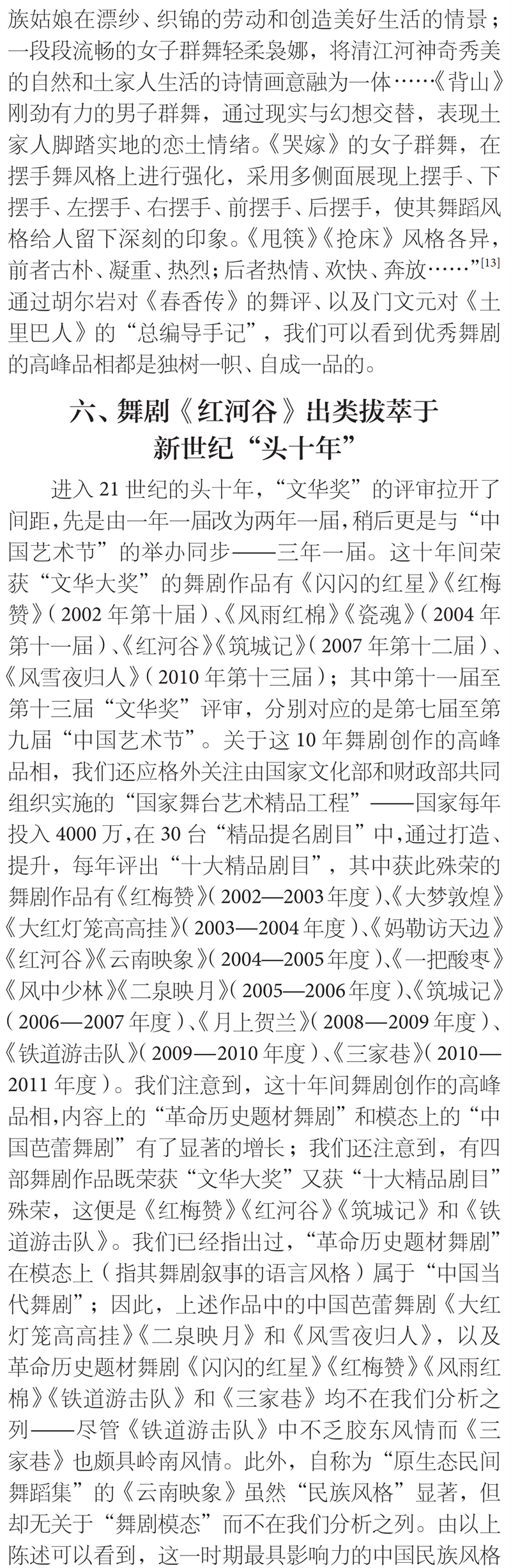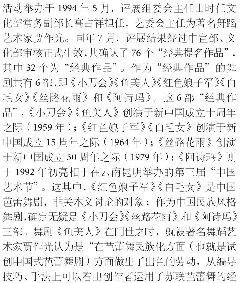 [摘 要] 中國(guó)民族風(fēng)格舞劇,是指這類舞劇敘事的語(yǔ)言風(fēng)格體現(xiàn)出鮮明的“民族性”——包括民族舞蹈語(yǔ)言的古典風(fēng)格、族群風(fēng)格和地域風(fēng)格。討論這類舞劇的高峰品相,一個(gè)重要的前提是面對(duì)那些經(jīng)過(guò)人民認(rèn)可、歷史選擇并體現(xiàn)國(guó)家意志的“經(jīng)典性”作品。本文分析的“經(jīng)典性”作品大約分布在四個(gè)時(shí)期:一是20世紀(jì)90年代中期開(kāi)展的“中華民族20世紀(jì)舞蹈經(jīng)典”的評(píng)展;二是20世紀(jì)90年代開(kāi)啟并實(shí)施的每年一屆的舞臺(tái)藝術(shù)政府獎(jiǎng)——“文華大獎(jiǎng)”的評(píng)選;三是21世紀(jì)頭十年“國(guó)家舞臺(tái)藝術(shù)精品工程”的選拔及逐步與“中國(guó)藝術(shù)節(jié)”同步的“文化大獎(jiǎng)”的評(píng)選;四是近十年(2013—2022)來(lái)四屆(第十屆至第十三屆)“中國(guó)藝術(shù)節(jié)”對(duì)“文華大獎(jiǎng)”作品的確認(rèn)。