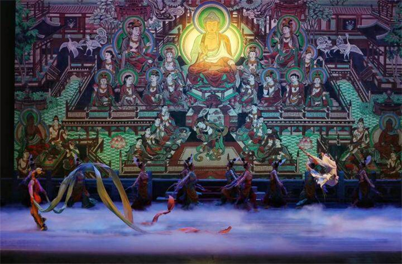 駝鈴陣陣,琵琶悠然,飛天曼妙,敦煌洞窟中的凝固壁畫,化成舞臺上的蹁躚舞姿,絲綢之路的故事在舞者們的演繹中徐徐展開。