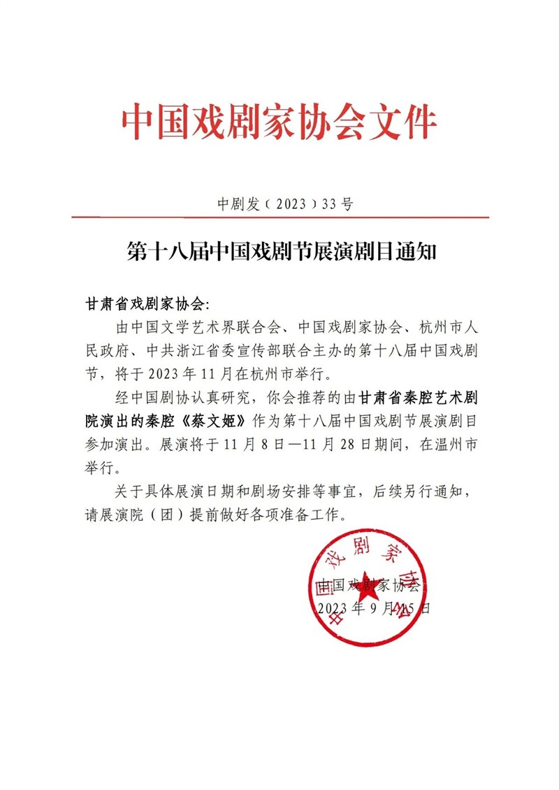 中國戲劇節(jié)始創(chuàng)于1988年,每兩年舉辦一屆,是我國戲劇界規(guī)模最大、水準最高的藝術(shù)盛會,對于我國戲劇事業(yè)的繁榮和發(fā)展起著重要的推動作用。經(jīng)過中國劇協(xié)相關(guān)專家嚴格評審篩選,甘肅秦腔藝術(shù)劇院歷時3年精心創(chuàng)排的大型秦腔歷史劇《蔡文姬》成功入選第十八屆中國戲劇節(jié)展演劇目。