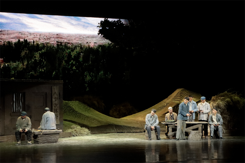 演員們以張弛有度的表演,在舞臺(tái)上展現(xiàn)了奮斗人生的力度與光彩,生動(dòng)詮釋了“困難面前不低頭、敢把沙漠變綠洲”的“八步沙”精神,八步沙“六老漢”質(zhì)樸堅(jiān)韌的當(dāng)代愚公風(fēng)骨。劇中精彩的二胡演奏、普通話與陜西方言的巧妙穿插、鏗鏘有勁的秦腔唱段,與古城厚重的歷史人文相得益彰,收獲了掌聲喝彩聲無數(shù),給觀眾們帶來強(qiáng)大的心靈震撼。全劇情節(jié)一波三折,以小見大,黑壓壓的沙塵暴鋪天而來時(shí),“六老漢”在嚴(yán)酷環(huán)境中吃盡苦頭,摸索出“一棵樹,一把草,壓住沙子防風(fēng)掏”的寶貴經(jīng)驗(yàn)。漫無邊際的沙漠終于出現(xiàn)一抹綠色,繼而,一棵又一棵綠樹成活成林,終成一片綠洲,觀眾的心也被藝術(shù)的琴弦撥動(dòng)。無論是昏天黑地、沙進(jìn)人退的灰暗壓抑,還是綠樹成蔭、鳥語花香的迷人浪漫,都過渡得柔和自然,處處彰顯著話劇《八步沙》大氣恢弘的舞臺(tái)格調(diào),為觀眾展現(xiàn)了一段已經(jīng)過去卻依然連接著當(dāng)下與將來的歷史,塑造了鮮明可信的人物群像,讓我們?cè)俅误w會(huì)到,一部優(yōu)秀的藝術(shù)作品一定會(huì)綻放精神的光彩。