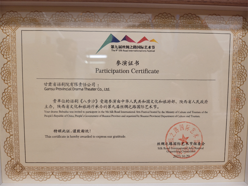 2019年9月,甘肅省文化和旅游廳全面啟動(dòng)話劇《八步沙》創(chuàng)排工作,在省委宣傳部、省文旅廳、甘肅演藝集團(tuán)、省文聯(lián)等各級(jí)領(lǐng)導(dǎo)的關(guān)懷支持下,2021年話劇《八步沙》作為甘肅省唯一一部戲劇作品晉京參加中宣部、文旅部、中國文聯(lián)“慶祝中國共產(chǎn)黨成立100周年優(yōu)秀舞臺(tái)藝術(shù)作品展演”。2022年1月話劇《八步沙》榮獲甘肅省委省政府文藝創(chuàng)作最高獎(jiǎng)——敦煌文藝獎(jiǎng);同年9月話劇《八步沙》以最佳的精神狀態(tài)和最完整的藝術(shù)效果在第十三屆中國藝術(shù)節(jié)上亮相,吸引了眾多省內(nèi)外媒體的聚焦宣傳,省內(nèi)外38家網(wǎng)絡(luò)平臺(tái)進(jìn)行了現(xiàn)場(chǎng)直播,網(wǎng)絡(luò)直播總訪問量高達(dá)1291.66萬人次,并最終榮獲第十七屆中國文化藝術(shù)政府獎(jiǎng)——文華大獎(jiǎng)提名劇目。在24日演出當(dāng)晚,陜西省文化和旅游廳二級(jí)巡視員李海龍為話劇《八步沙》頒發(fā)第九屆絲綢之路國際藝術(shù)節(jié)“絲路文化貢獻(xiàn)獎(jiǎng)”獎(jiǎng)杯、獎(jiǎng)牌,話劇院副院長、藝術(shù)總監(jiān)郁海濱上臺(tái)領(lǐng)獎(jiǎng)——這是話劇《八步沙》繼榮獲多個(gè)重要獎(jiǎng)項(xiàng)之后的又一殊榮!