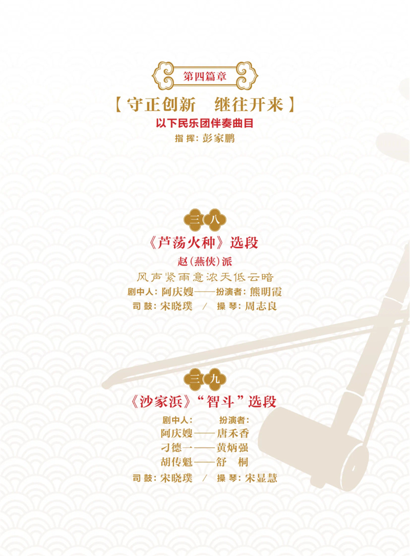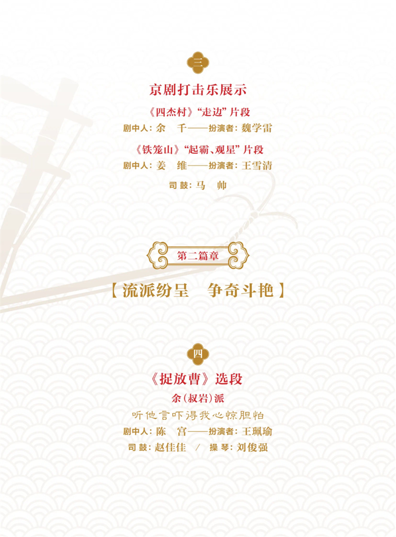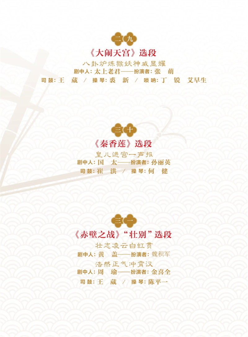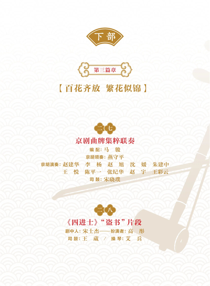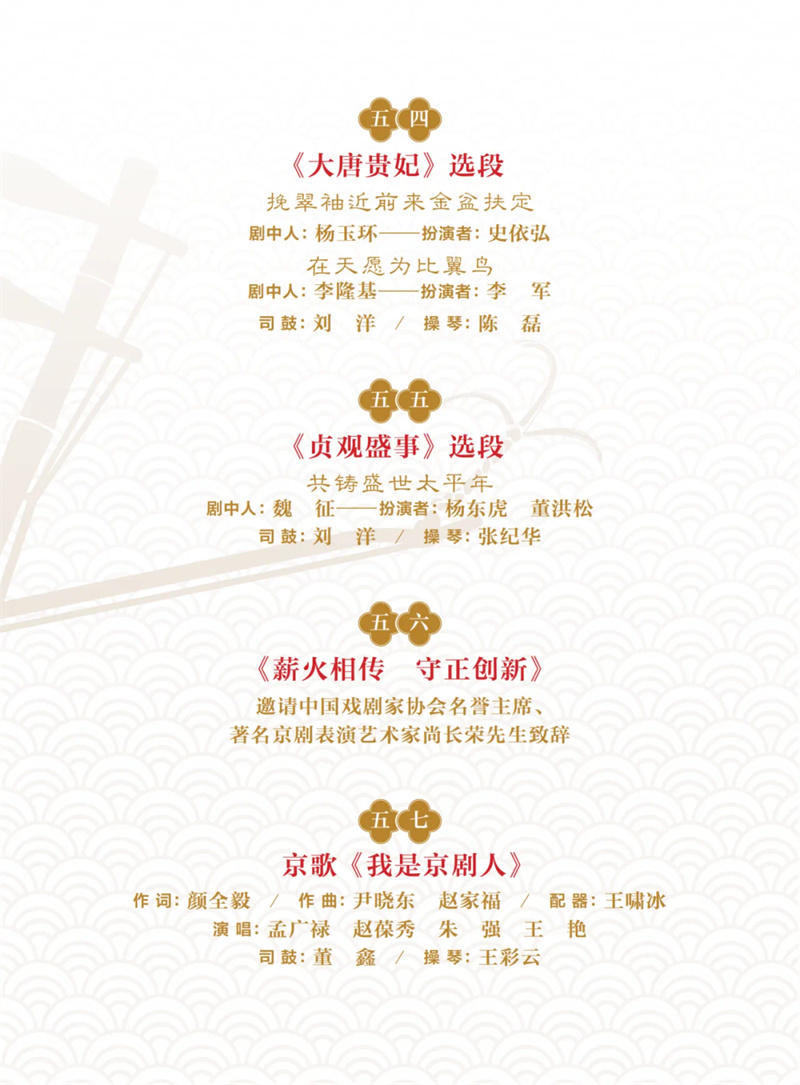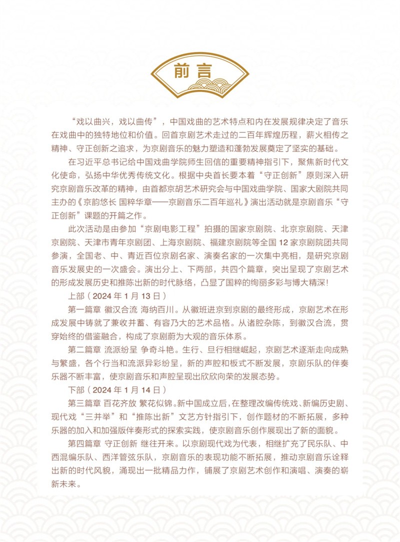 在習(xí)近平總書(shū)記給中國(guó)戲曲學(xué)院師生重要回信精神的指導(dǎo)下,本次演出致力于新時(shí)代新的文化使命,弘揚(yáng)中華優(yōu)秀傳統(tǒng)文化,成為京劇音樂(lè)“守正創(chuàng)新”課題的開(kāi)篇之作。演出分為上下兩部,全國(guó)12家京劇院團(tuán),包括國(guó)家京劇院、北京京劇院、天津京劇院、天津市青年京劇團(tuán)、上海京劇院、福建京劇院等共同參演,百位京劇名家、演奏名家云集。