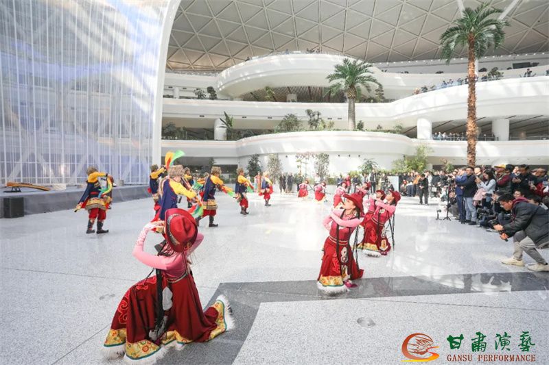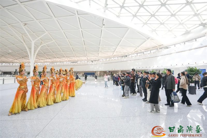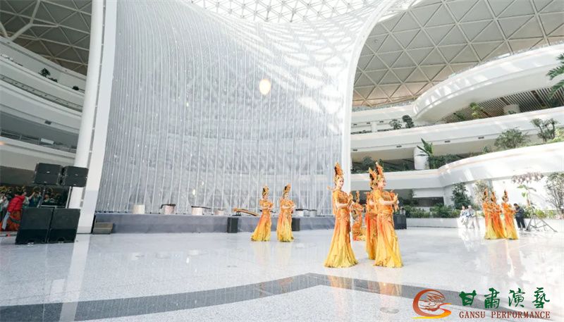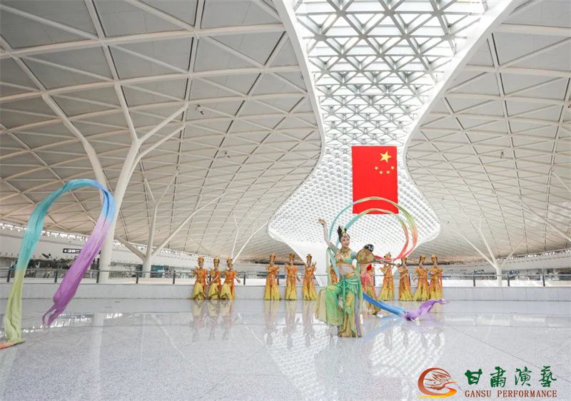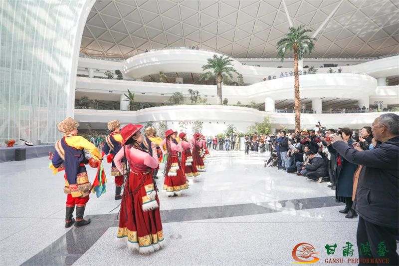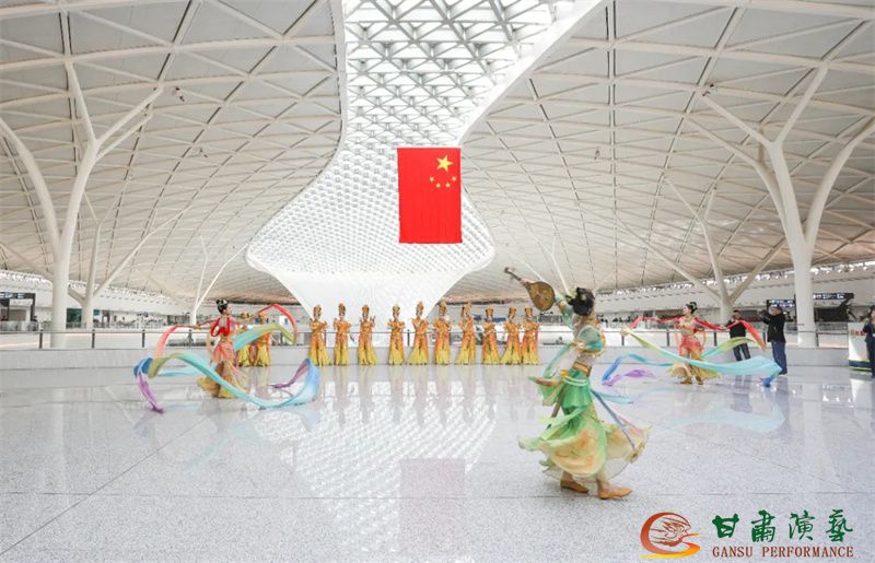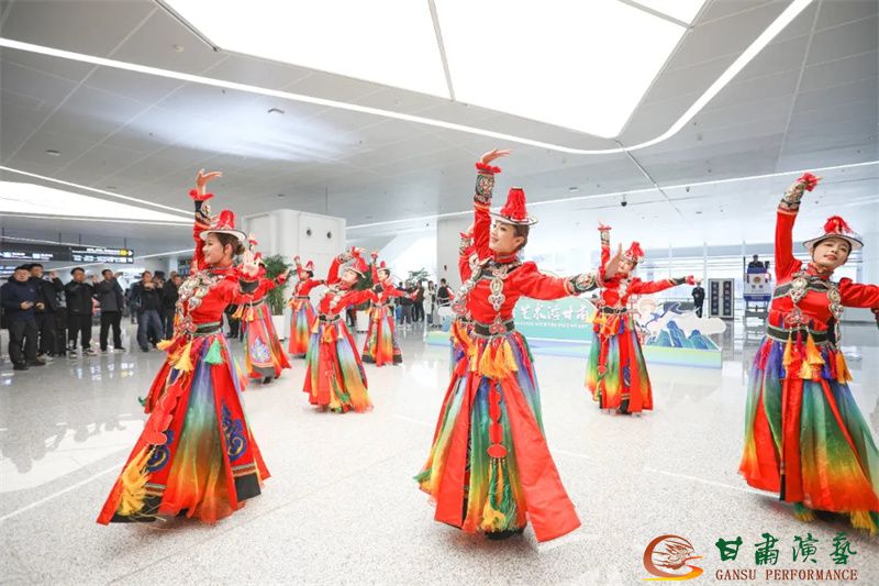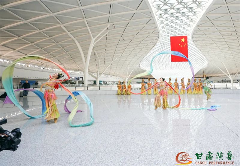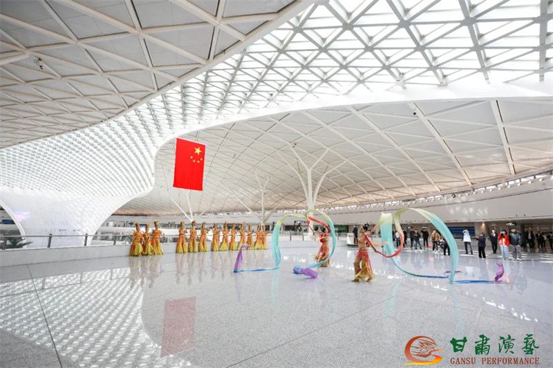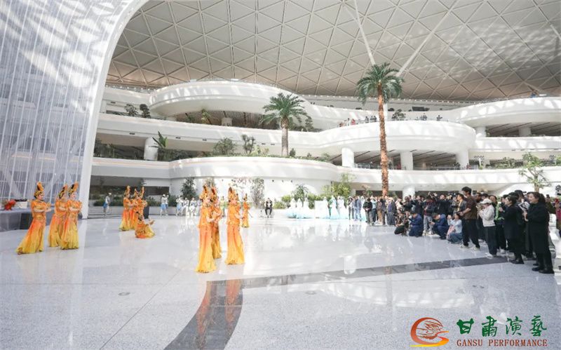 為使旅客和觀眾在這一新城市地標(biāo)建筑中感受不一樣的西北韻味,本次演出匠心獨(dú)運(yùn)注重“創(chuàng)意+體驗(yàn)”,在出發(fā)大廳、到達(dá)大廳、連廊大廳設(shè)三個(gè)快閃點(diǎn),交通樞紐大廳設(shè)置展演舞臺(tái),《絲路花雨》經(jīng)典片段《金光千佛》拉開(kāi)活動(dòng)序幕,舞者身披金色華服,以曼妙舞姿再現(xiàn)莫高窟壁畫中“千佛齊現(xiàn)”的恢宏場(chǎng)景,祈愿往來(lái)游客起落平安,《反彈琵琶長(zhǎng)綢舞》演員手持琵琶翩然起舞,長(zhǎng)綢翻飛間,敦煌藝術(shù)的靈動(dòng)與絲路文明的交融之美躍然眼前,跨越千年的石窟藝術(shù)與航站樓現(xiàn)代設(shè)計(jì)交相輝映,引得旅客紛紛駐足拍攝,裕固族舞蹈《歡騰的草原》展現(xiàn)甘肅人民的熱情好客、淳樸熱情以及甘肅豐富的歷史文化和民俗風(fēng)情,《玄奘西行》《雪域歡歌》《花兒美》則展現(xiàn)出甘肅多元文化的美妙厚重與自然風(fēng)光的壯美神秘。隨著《我把甘肅唱給你聽(tīng)》的旋律漸息,這場(chǎng)跨越時(shí)空的藝術(shù)之旅圓滿落幕,中川機(jī)場(chǎng)T3航站樓化身“流動(dòng)的藝術(shù)展廳”,把“交響絲路·如意甘肅”的壯美畫面描繪在了每一位旅客心中。