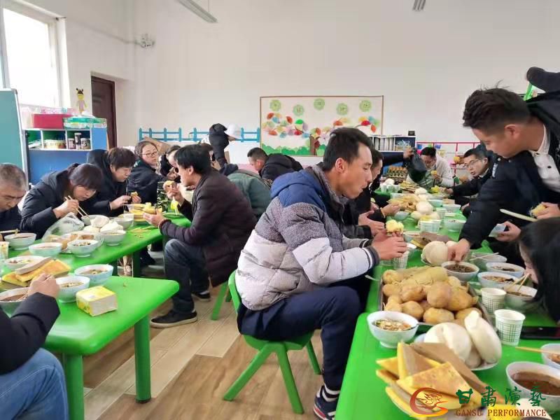 在本次演出期間,恰逢初冬,天寒變化無(wú)常,在演出中,演職人員冒著刺骨寒風(fēng),在四處漏風(fēng)的簡(jiǎn)易舞臺(tái)上,身著單薄演出服裝精益求精地為當(dāng)?shù)厝嗣袢罕娧莩?。由于連續(xù)奔波,無(wú)法按時(shí)就餐,當(dāng)?shù)厝嗣袢罕娋驮谖枧_(tái)邊架起一口大鍋煮上洋芋、玉米,演出人員在演出間隙在舞臺(tái)旁的“幼兒園”小教室充充饑,大家稱之為“甘秦人吃的是老百姓的綠色食品,我們報(bào)答人民的是精神食糧”。