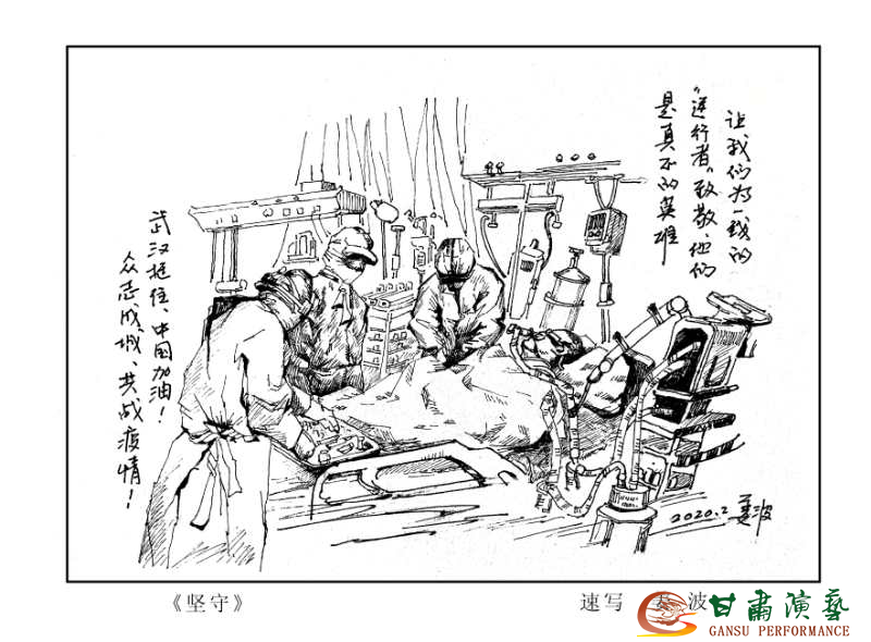 疫情防控阻擊戰(zhàn)在全國打響后,話劇院文藝工作者攜手并肩、各展所長,通過詩朗誦、工筆畫、速寫等藝術形式,線上線下聚焦一線踴躍創(chuàng)作。話劇院國家一級舞美設計師姜波創(chuàng)作的《爭分奪秒》《堅守》《云開霧散》速寫作品,為打贏疫情防控阻擊戰(zhàn)傳遞正能量。 (圖/文由甘肅省話劇院提供)