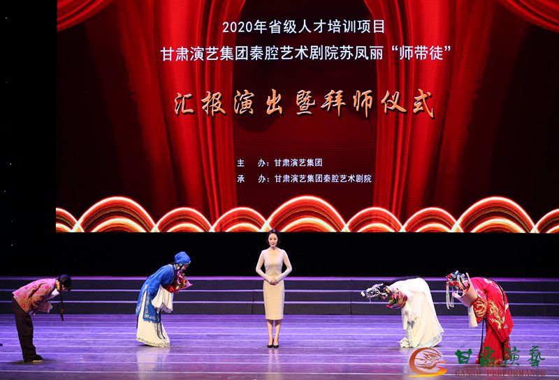 在現(xiàn)場近千名觀眾的見證下,甘肅演藝集團(tuán)秦腔藝術(shù)劇院優(yōu)秀青年演員郭鋒、羅娜、李晨、竇瑋正式拜師著名秦腔表演藝術(shù)家蘇鳳麗,并進(jìn)行“師帶徒”匯報(bào)演出。甘肅演藝集團(tuán)秦腔藝術(shù)劇院院長崔華功致辭,來自陜西、寧夏的兩位中國戲劇梅花獎(jiǎng)二度梅獲得者李東橋、柳萍應(yīng)邀做助興演出。