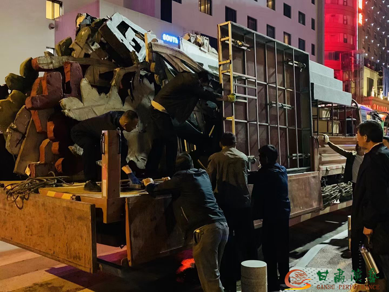 5月17日,劇院舞美燈光道具的相關(guān)工作人員,就已不辭辛勞,早早奔赴西安易俗大劇院,為劇院5月20日、21日在此地上演的大型秦腔傳統(tǒng)劇目《鎖麟囊》打好前站。劇院工作人員們充分發(fā)揚“能吃苦、能戰(zhàn)斗、能奉獻”的拼搏精神,連夜將劇目的舞美道具從大車上卸下,直至深夜三點多大家還在進行緊鑼密鼓的布置,為即將到來的盛大演出默默地付出著辛勞與汗水。