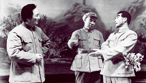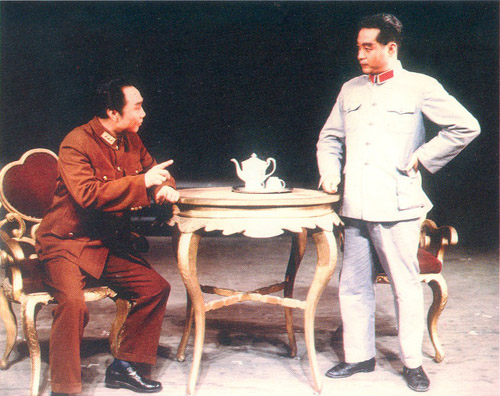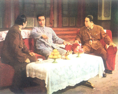 事變發(fā)生后,我們敬愛(ài)的周恩來(lái)副主席受黨中央毛主席的重托,親臨西安以無(wú)產(chǎn)階級(jí)革命家雄偉的氣魄和膽略,力挽狂瀾,揭穿日本帝國(guó)主義和親日派的陰謀,說(shuō)服張、楊兩將軍,逼使蔣介石接受“停止內(nèi)戰(zhàn)、一致抗日”的主張,和平解決了西安事變。