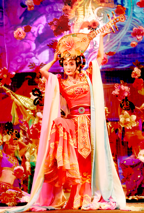 敦煌交易盛會(huì)上,大唐節(jié)度使與二十七國來賓歡聚一堂。英娘化妝獻(xiàn)藝,借機(jī)力陳強(qiáng)盜罪狀,節(jié)度使下令將市令等斬首。剪除了絲路上的匪患。英娘和張恩在悲愴和激奮情緒的交替中完成了神圣的使命。美輪美奐的“反彈琵琶”瞬間誕生了!無數(shù)“飛天”剎時(shí)升騰翱翔,東西文化交流的偉大使者溶進(jìn)了歷史的畫卷。