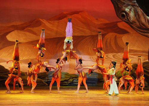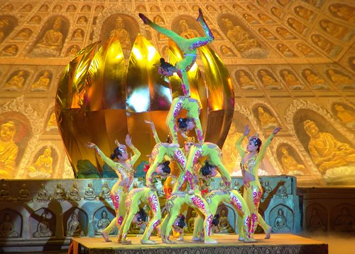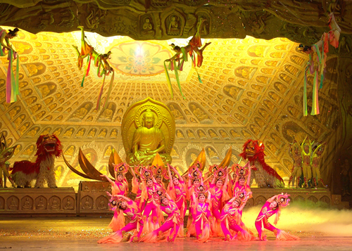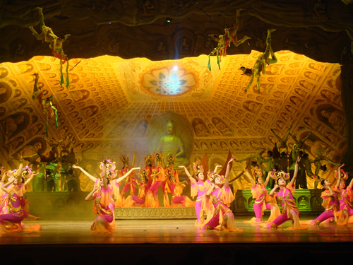 大型雜技劇《敦煌神女》是在敦煌莫高窟壁畫佛教故事的基礎(chǔ)上創(chuàng)作的,她主要表現(xiàn)了 “正義與邪惡”、“善良與殘暴”的斗爭,塑造了“神女”不惜生命勇于自我犧牲的一個偉大母親的光輝形象和為人民無私奉獻(xiàn)的高尚情懷,她代表著我們中華民族不屈不撓的精神和民族之魂!