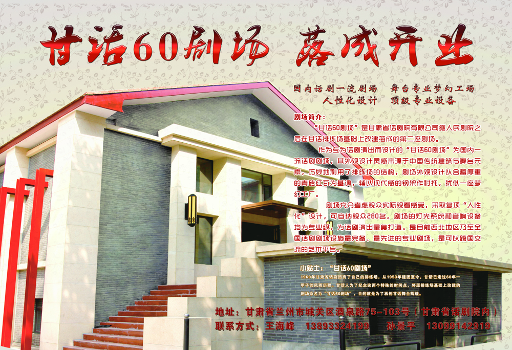 甘話60劇場是甘肅演藝集團(tuán)話劇院繼蘭州人民劇院之后在甘話排練場基礎(chǔ)上改建落成的第二座劇場。1960年甘肅演藝集團(tuán)話劇院(時(shí)為甘肅省話劇團(tuán))有了自己的排練場,而從1953年建團(tuán)至今,甘話已走過60年一甲子的風(fēng)雨歷程。甘話人為了紀(jì)念這兩個(gè)特殊的時(shí)間點(diǎn),將原排練場基礎(chǔ)上改建的劇場命名為“甘話60劇場”,目的就是為了再創(chuàng)甘話舞臺輝煌。作為專為話劇演出而設(shè)計(jì)改建的甘話60劇場,為國內(nèi)一流話劇劇場,其外觀設(shè)計(jì)靈感來源于中國傳統(tǒng)建筑與舞臺元素,巧妙地利用了排練場的結(jié)構(gòu),劇場外觀設(shè)計(jì)以含蓄厚重的青磚紅瓦為基調(diào),輔以現(xiàn)代感的鋼架作襯托,猶似一座夢幻工廠。