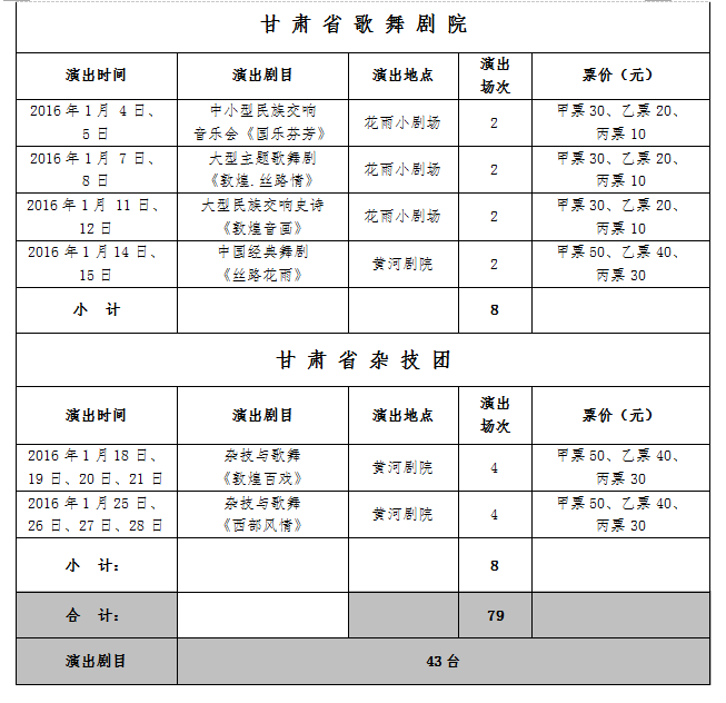 甘肅演藝集團成立于2012年4月,由原甘肅省直藝術表演院團按照現(xiàn)代企業(yè)制度的要求組建而成,為省屬大型國有獨資文化企業(yè),擁有實力雄厚的專業(yè)藝術創(chuàng)作和表演力量,創(chuàng)作和積累了一大批舞臺藝術精品劇目,屢獲國家大獎。值此抗日戰(zhàn)爭暨世界反法西斯戰(zhàn)爭勝利70周年之際,在省委省政府的大力支持下,采取政府購買演出服務的方式開展低票價惠民演出活動,推出“紀念中國人民抗日戰(zhàn)爭暨世界反法西斯戰(zhàn)爭勝利70周年”演出季和“舞臺精品惠百姓”演出年兩個板塊的惠民演出活動,以滿足廣大市民對舞臺藝術的渴盼。