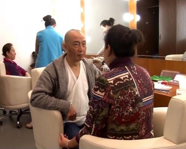 排練到下午6點,劇組人員拿到了美味的盒飯,來補充耗盡的體力。此時,甘肅省話劇院院長朱衡提前開始化妝。在今晚的《天下第一橋》話劇中,他飾演的是男一號“彭英甲”。