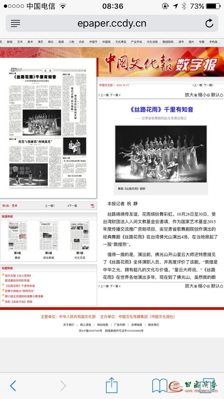 ?。ū緢笥浾?nbsp; 祝 靜)絲路綿綿傳友誼,花雨繽紛舞彩虹。10月28日至30日,受臺灣財團法人人間文教基金會邀請,作為國家藝術(shù)基金2015年度傳播交流推廣資助項目,由甘肅省歌舞劇院創(chuàng)作演出的經(jīng)典舞劇《絲路花雨》在臺灣佛光山演出4場,在當(dāng)?shù)叵破鹆艘还伞岸鼗蜔帷薄?nbsp;