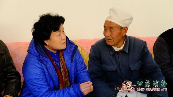 經(jīng)過艱難行程,中午近12點(diǎn)才來到鄭九林家的住地。鄭九林居住的山坡上,共住有鄭九林、鄭九君兩家人,根據(jù)居住位置,朱董事長一行首先來到了鄭九君家慰問調(diào)查。鄭九君家共6口人,80歲的父親和76歲的母親,兩位老人身體健康,還能生火做飯,飼養(yǎng)牲畜,在生產(chǎn)生活方面給兒女予以幫助。一雙兒女,一個上高中,一個上初中,尊敬師長,孝敬老人。夫妻二人勤奮努力,精心耕作45畝耕地,飼養(yǎng)了48只羊,兩頭牛和兩頭驢,去年新蓋的房屋寬敞明亮,生活過的紅紅火火。剛剛飼喂完牲畜的父子倆笑聲朗朗的將朱董事長一行迎入家中,端茶倒水,熱情接待,并挽留朱董事長一行在家吃午飯。朱董事長拉著老人的手,詳細(xì)詢問身體情況及生產(chǎn)生活情況,送上豬肉等慰問品,表達(dá)了演藝院團(tuán)全體演職人員的深情厚意,并給兩位老人照了相,祝愿兩位老人身體健康,新的一年生活更好。老人樂的合不攏嘴,一再表示感謝。