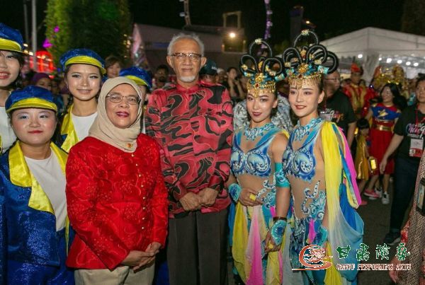特別是在同17個國家參與的“2019妝藝大游行”的6場演出中,雜技團(tuán)以獨(dú)具魅力的敦煌“飛天”形象,通過“肩上芭蕾”“抖空竹”“轉(zhuǎn)花蝶”等技藝高難、婀娜多姿、輕盈飄逸、節(jié)奏明快的表現(xiàn)形式,展現(xiàn)了極具民族地域特色的雜技節(jié)目,贏得了出席“2019妝藝大游行”新加坡總統(tǒng)哈莉瑪·雅各布、總理李顯龍先生等新加坡國家政要和現(xiàn)場5萬余名觀眾的熱烈歡迎和喝彩。每逢雜技團(tuán)的節(jié)目入場,活動主持人都會激動地重復(fù)“China GanSu perfect ”(來自中國甘肅的完美表演 ),演出現(xiàn)場激情更加高漲。新加坡總統(tǒng)哈莉瑪·雅各布、總理李顯龍觀看演出后,與演員親切握手交談,給予雜技團(tuán)演出隊(duì)伍高度評價,并與演職人員合影留念,印證了中新的友好交往,留下了中新友好交往的歷史畫面。