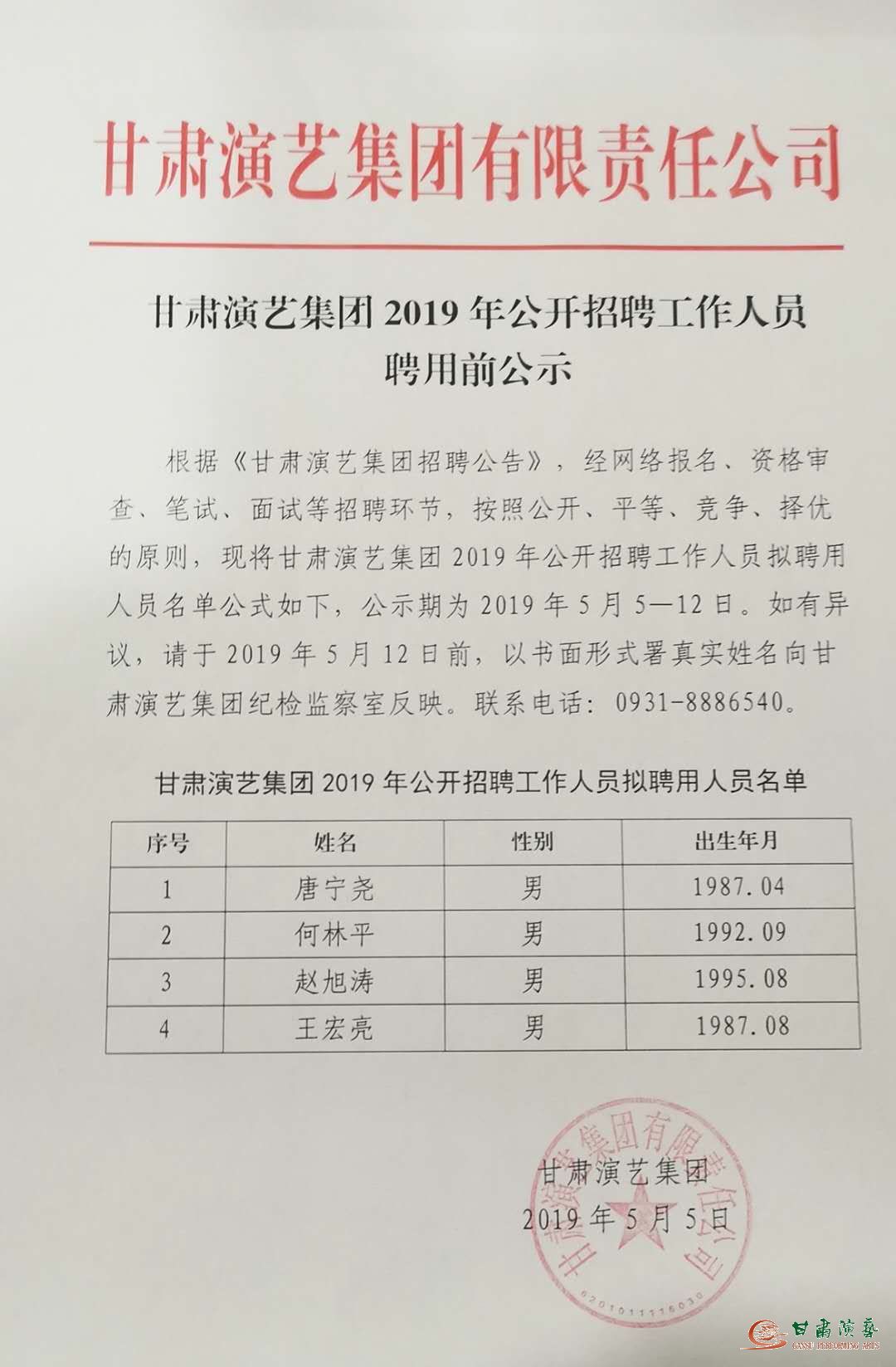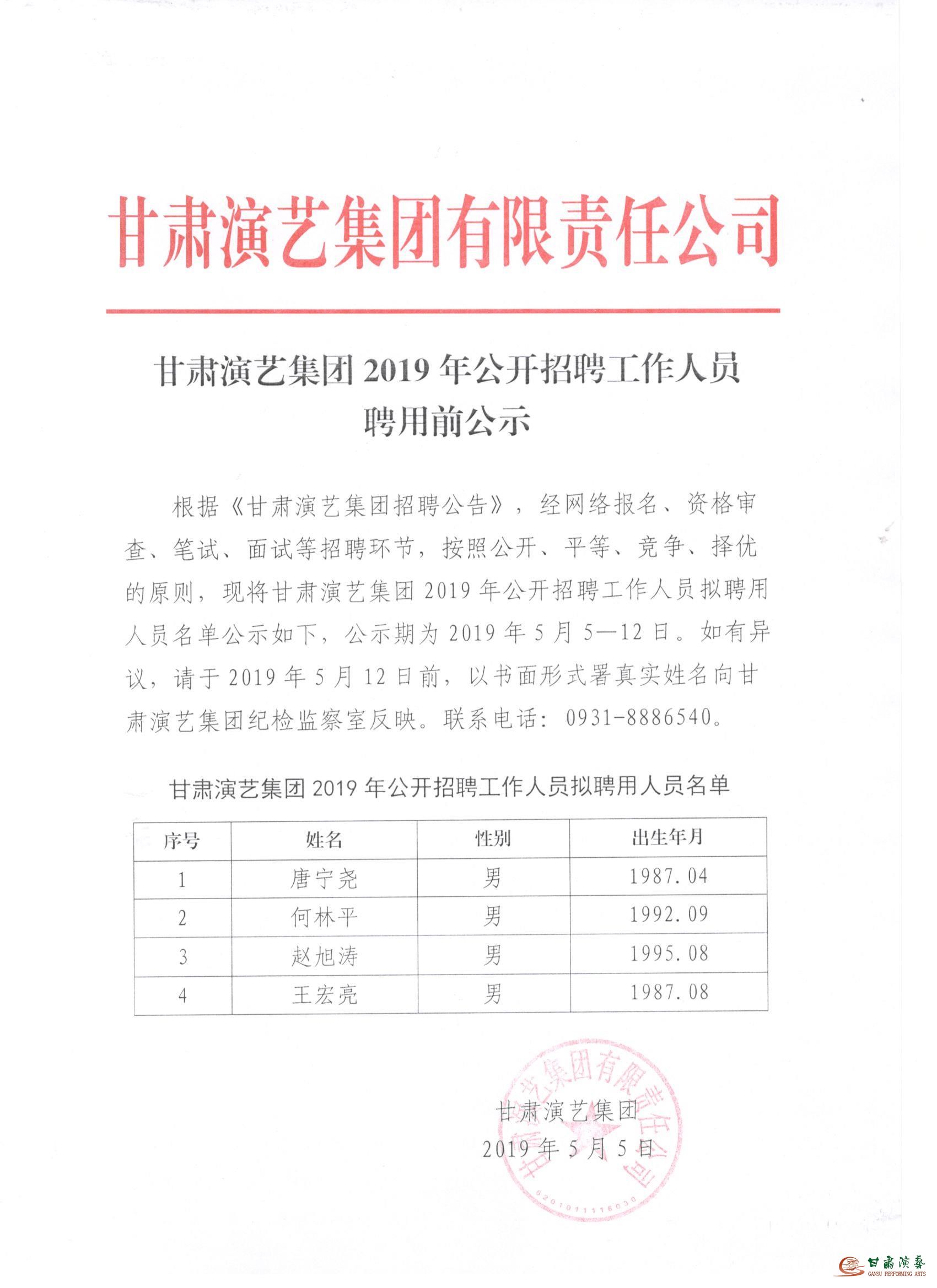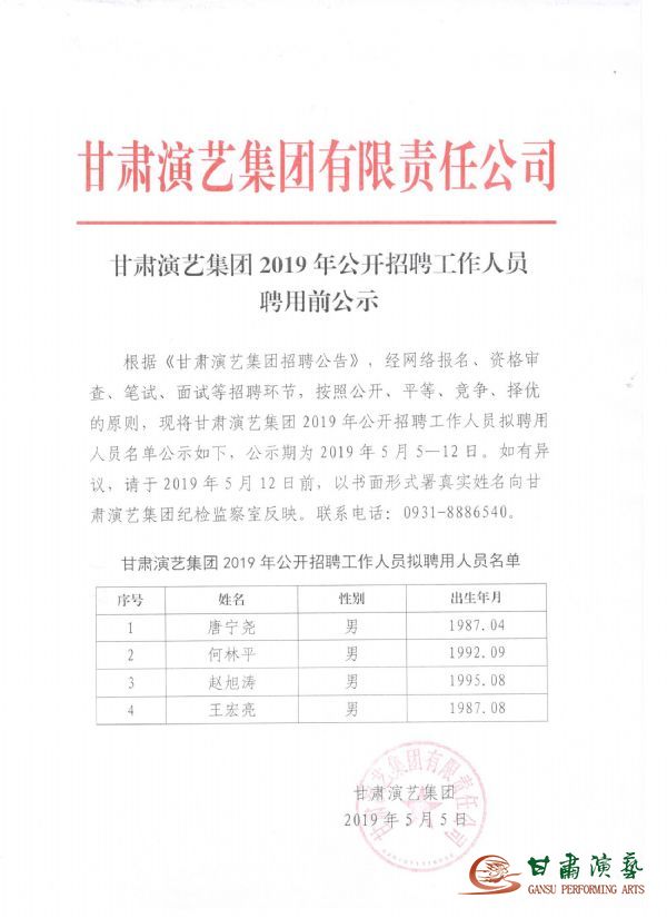 甘肅演藝集團(tuán)2019年公開招聘工作人員聘用前公示