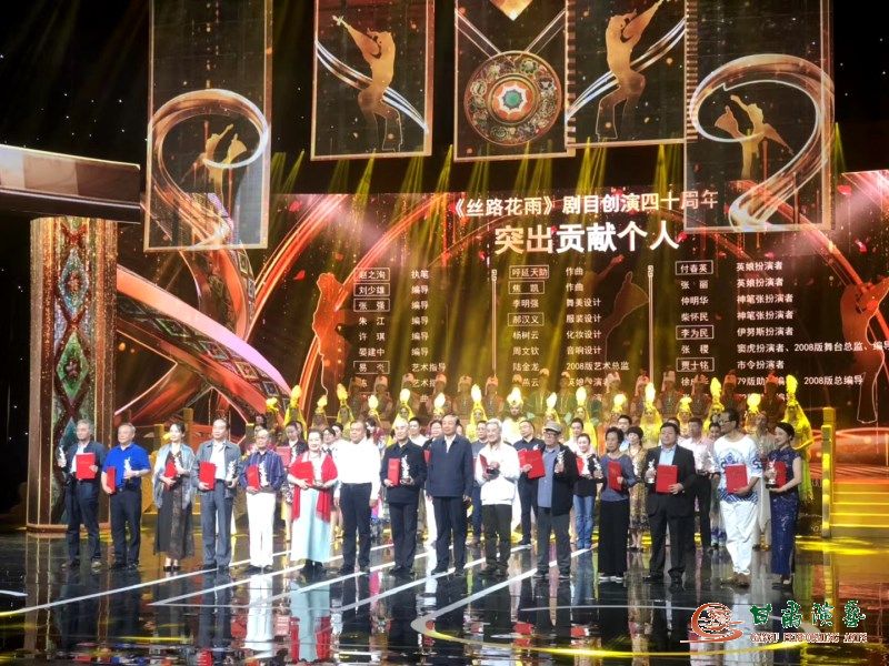 當(dāng)晚,由中共甘肅省委宣傳部主辦,甘肅省文化和旅游廳、甘肅省文聯(lián)、甘肅日?qǐng)?bào)社、甘肅新媒體集團(tuán)協(xié)辦,甘肅演藝集團(tuán)、甘肅廣播電視總臺(tái)承辦的紀(jì)念《絲路花雨》創(chuàng)演40周年文藝晚會(huì)在甘肅大劇院舉行,晚會(huì)上,省委宣傳部對(duì)《絲路花雨》劇目突出貢獻(xiàn)集體,朱江、許琪、晏建中、陸金龍、張稷等28人《絲路花雨》劇目創(chuàng)演40周年突出貢獻(xiàn)個(gè)人,向牟瑜、樊玲、楊亦兵、楊傳弘、王瓊、韓晶、韓煦、安寧、康琦、曹飛、趙敏、周虹、張博、席佳麗、趙莉等15人《絲路花雨》劇目創(chuàng)演40周年優(yōu)秀傳承人進(jìn)行了表?yè)P(yáng)。晚會(huì)分為誕生、守望、綻放、絲路繽紛四個(gè)篇章,演出中眾多主創(chuàng)人員與傳承者還通過(guò)情景再現(xiàn)的方式再登舞臺(tái),共同訴說(shuō)40年《絲路花雨》的經(jīng)典傳奇。紀(jì)念晚會(huì)在觀眾的掌聲、喝彩聲和繽紛的吉祥花雨中圓滿(mǎn)落下帷幕。