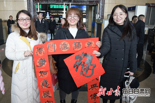 在南昌和西安上大學的李盼盼和張靚、王思約好在蘭州一起返回白銀?!皼]想到在車站侯車的時候會收到春聯(lián)和祝福,我們覺得這是2019年的好兆頭,真是很開心?!?