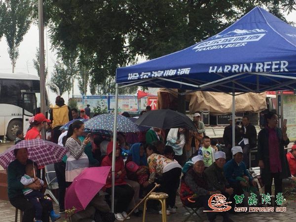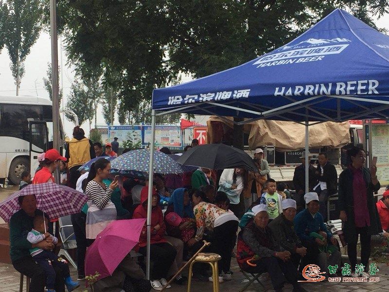 在傾盆大雨中,熱情的觀眾們打著雨傘不愿離去,他們唉聲嘆氣,議論紛紛,“好不容易能看一場省上的演出了,結(jié)果剛開始就下雨了”他們遺憾地說道。半個多小時過去了,雨勢不減。看著群眾們期盼的眼神和雨中等待的不易,帶隊領(lǐng)導(dǎo)征求演職人員意見后,將演出移至村文化活動室進行。由于文化活動室狹小,甘肅演藝集團秦腔藝術(shù)劇院的演職人員和村干部們一道在活動室門口打起了為群眾們遮雨的雨棚。