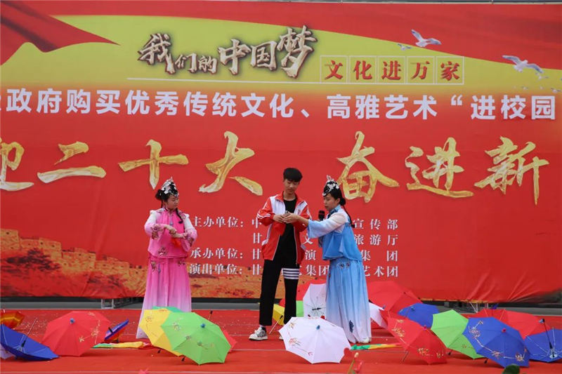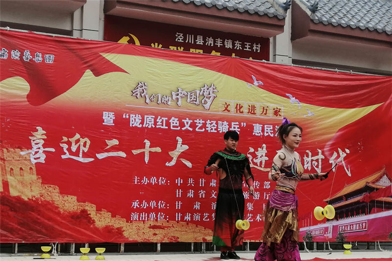 端午節(jié)前夕,由中共甘肅省委宣傳部、甘肅省文化和旅游廳主辦,甘肅演藝集團敦煌藝術(shù)團承辦的“我們的中國夢—文化進萬家”省級政府購買“進校園”“進校園”“隴原紅色文藝輕騎兵”惠民演出活動走進平?jīng)龅貐^(qū)。在靜寧縣、平?jīng)鍪小艽h,崇信縣的學校、軍營、鄉(xiāng)鎮(zhèn)文化廣場等地向基層人民及學校師生送上了一場豐厚的文化盛宴。