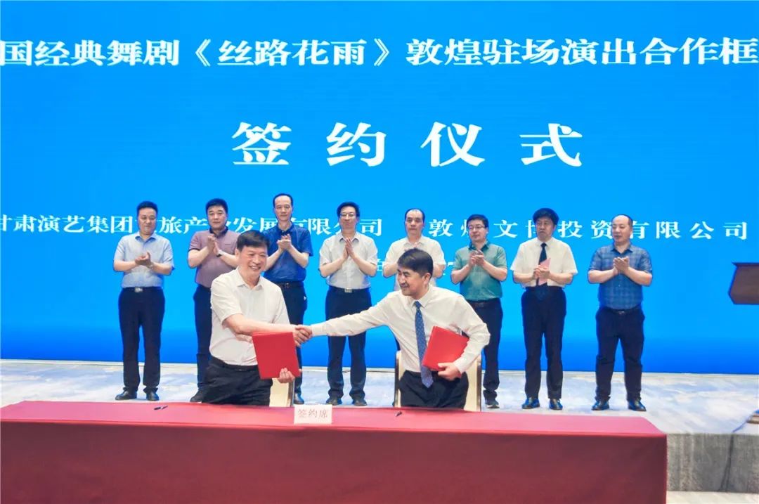 6月17日,甘肅演藝集團文旅產(chǎn)業(yè)發(fā)展有限公司和敦煌文博投資有限公司在敦煌國際會展中心聯(lián)袂舉行中國經(jīng)典舞劇《絲路花雨》敦煌駐場演出簽約儀式。敦煌市政府副市長路育剛,敦煌市文旅局黨組書記、局長陳錦業(yè),敦煌市財政局黨組書記、局長周東,敦煌市國資運營中心主任王海云,敦煌文博投資有限公司黨組織書記、提名董事長孫雪虎 ,以及甘肅演藝集團黨委書記、董事長陳其銀,黨委副書記、總經(jīng)理劉小承等領(lǐng)導(dǎo)出席了當天的簽約儀式。