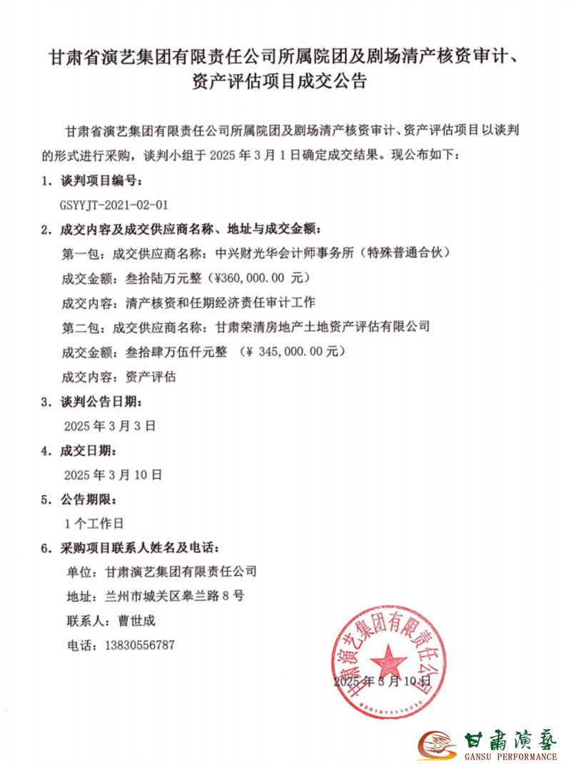 甘肅省演藝集團有限責(zé)任公司所屬院團及劇場清產(chǎn)核資審計、資產(chǎn)評估項目成交公告
