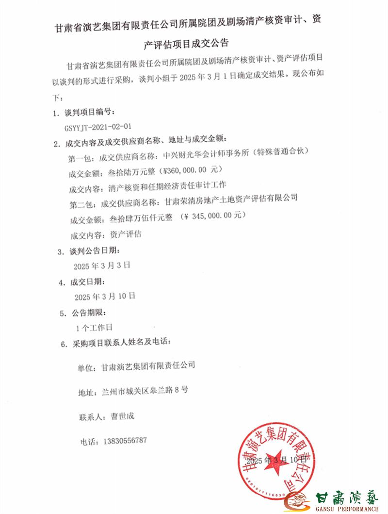 甘肅省演藝集團(tuán)有限責(zé)任公司所屬院團(tuán)及劇場清產(chǎn)核資審計、資產(chǎn)評估項(xiàng)目成交公告