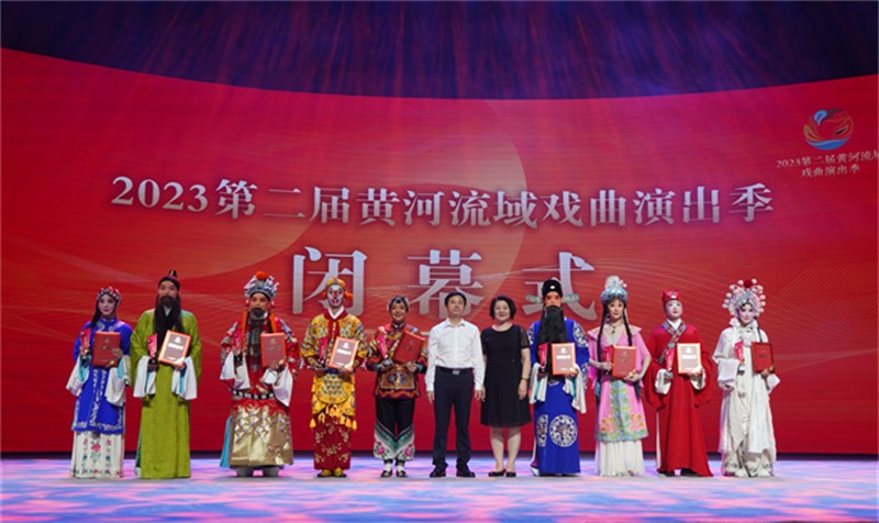 閉幕儀式上,經(jīng)專家推選,30名參演的優(yōu)秀中青年演員被授予“2023黃河流域戲曲演出季表演藝術(shù)傳承英才”榮譽,文化和旅游部藝術(shù)司副司長黃小駒、山東省文化和旅游廳副廳長孫蕾為獲得“2023第二屆黃河流域戲曲演出季表演藝術(shù)傳承英才”榮譽的演員代表頒發(fā)證書。評審專家代表、中國戲曲表演學會會長黎繼德宣讀名單。甘肅省京劇團潘鈺、平?jīng)鰶芎铀囆g(shù)劇院張磊榮獲“2023第二屆黃河流域戲曲演出季表演藝術(shù)傳承英才”榮譽稱號。