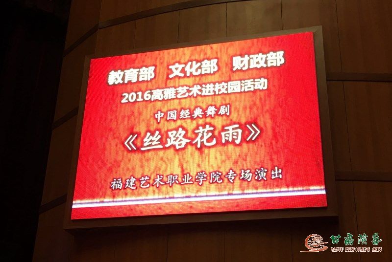 自11月7日始,甘肅省歌舞劇院歷時(shí)37年、出訪40多個(gè)國家、演出2800余場(chǎng)、觀眾超400萬人次的經(jīng)典舞劇《絲路花雨》繼在福建閩江師范高等專科學(xué)校、福建工程學(xué)院、福建醫(yī)科大學(xué)及福建師范大學(xué)分別驚艷亮相并贏取無數(shù)贊譽(yù)之后,又于11月11晚7點(diǎn),在福建藝術(shù)職業(yè)學(xué)院精彩登場(chǎng),收獲了同樣的好評(píng)。至此,在由國家文化部、財(cái)政部及教育部主辦的“2016高雅藝術(shù)進(jìn)校園”高校巡演重大演出活動(dòng)中,《絲路花雨》以精彩迭起的表現(xiàn),如期圓滿完成了福建站5所知名高校的演出任務(wù),為接下來赴廣東、浙江高校的演出打好了美麗的前站。
