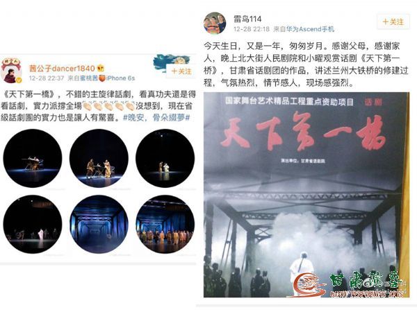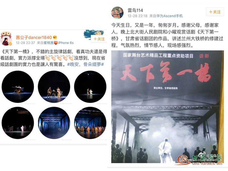 有觀眾在微博評(píng)論說(shuō):“《天下第一橋》,不錯(cuò)的主旋律話劇,看真功夫還是得看話劇,實(shí)力派撐全場(chǎng)沒(méi)想到,現(xiàn)在省級(jí)話劇院的實(shí)力也是讓人有驚喜?!薄敖裉焐?,又是一年,匆匆歲月。感謝父母,感謝家人,晚上北大街人民劇院和小曜觀賞話劇《天下第一橋》,甘肅省話劇院的作品,講述蘭州大鐵橋的修建過(guò)程,氣氛熱烈,情節(jié)感人,現(xiàn)場(chǎng)感強(qiáng)烈。”(圖文由甘肅省話劇院提供)