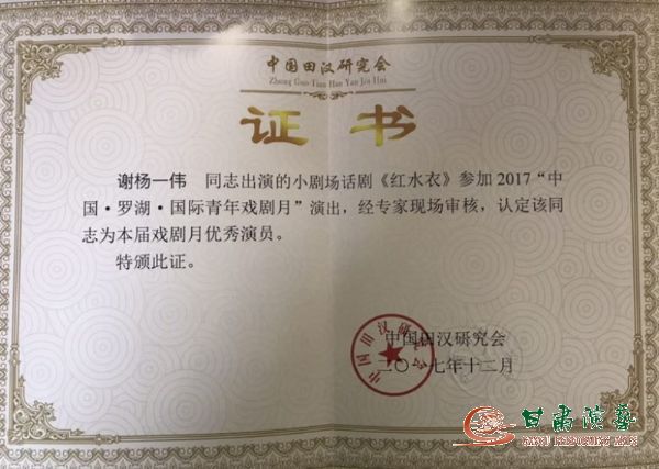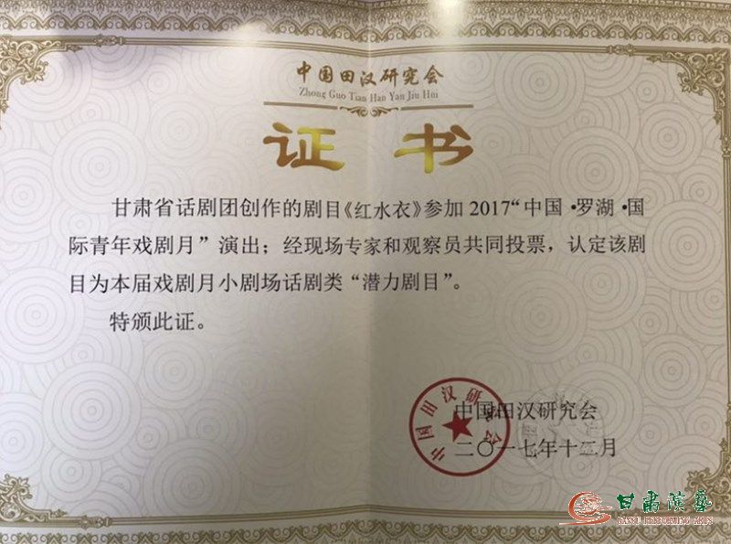 由北京東城區(qū)群藝館組織,為“紀(jì)念中國(guó)話劇誕辰110周年·戲劇東城10周年全國(guó)話劇優(yōu)秀新劇目展演季”,2017年12月19日、20日甘肅省話劇院話劇《紅水衣》在北京風(fēng)尚劇場(chǎng)演出,演出獲得極高的評(píng)價(jià),很多觀眾在演出結(jié)束后紛紛上臺(tái)與演員交流!就在北京演出的同時(shí),甘肅省話劇院又接到深圳“中國(guó)·羅湖·國(guó)際青年戲劇月”的通知,話劇《紅水衣》經(jīng)現(xiàn)場(chǎng)專(zhuān)家和觀察員共同投票,認(rèn)定該劇目為本屆戲劇月小劇場(chǎng)話劇類(lèi)“潛力劇目”,同時(shí)該劇編劇王元平、主演謝楊一偉分別榮獲了戲劇月優(yōu)秀編劇獎(jiǎng)和優(yōu)秀演員獎(jiǎng)。(圖文由甘肅省話劇院提供)