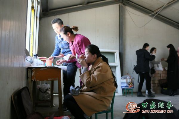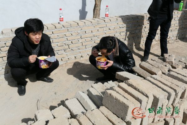 下午1時,清水縣紅堡鎮(zhèn)新坪村文化廣場,演出音響傳出的陣陣秦腔唱段聲和村委會通知村民觀看演出的廣播聲交織成了一股熱鬧、和諧的特有場景,聚集而來的小朋友串進串出,好奇地打量著每一個地方和物品,老人們早早地拿著板凳在舞臺前“占”好了地方。簡陋的工程板房內(nèi),演員在磚堆上放一面鏡子就開始了化妝,脫下暖和的棉衣,換上了單薄的演出服裝;由于沒有地方吃中午飯,王建平院長及演職人員拿起準備的破面,在工程板房內(nèi)和村文化廣場邊的轉(zhuǎn)對上就地吃了起來,看到此景,新坪村的村干部和村民感動異常,發(fā)動村民提來了開水,并連聲說“謝謝”!