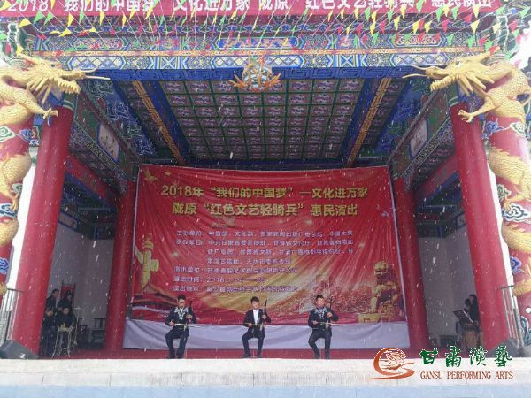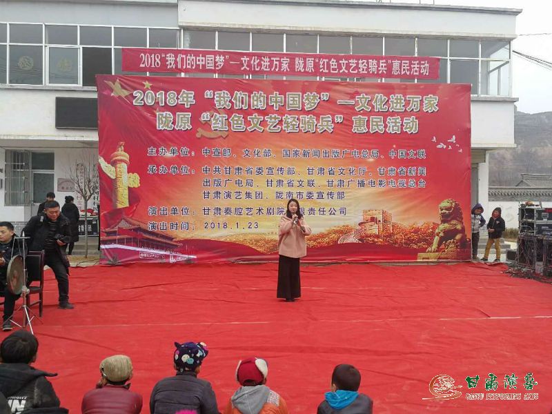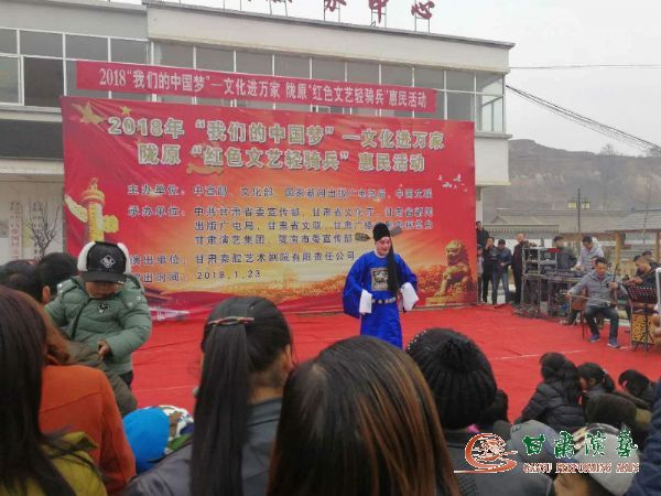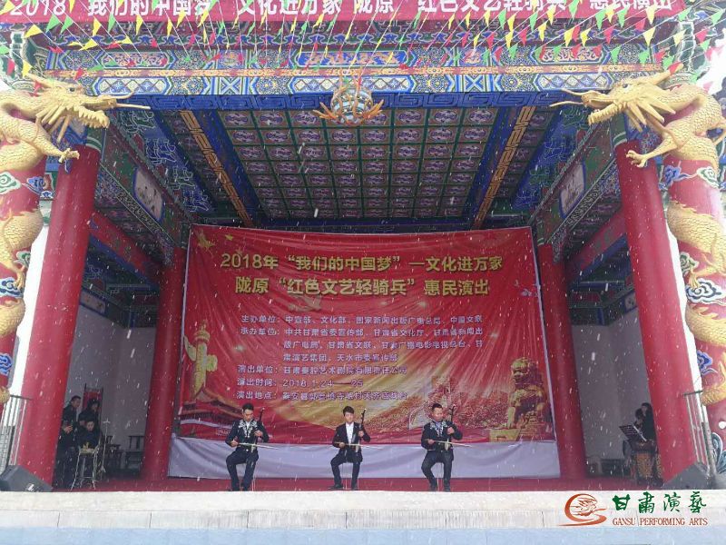 為深入學(xué)習(xí)貫徹黨的十九大精神和習(xí)近平總書記對(duì)烏蘭牧騎“紅色文藝輕騎兵”重要指示精神,落實(shí)中宣傳部關(guān)于2018年元旦春節(jié)期間廣泛開展“我們的中國夢(mèng)”——文化進(jìn)萬家活動(dòng)的要求,2018年1月22日至26日,甘肅秦腔藝術(shù)劇院的50余名演職人員冒著凜冽的寒風(fēng)和大雪,赴西和縣蘇合鄉(xiāng)張家河村、石峽鎮(zhèn)石峽村及秦安縣郭嘉鎮(zhèn)寺開展“我們的中國夢(mèng)”文化進(jìn)萬家暨隴原“紅色文藝輕騎兵”惠民演出活動(dòng)。