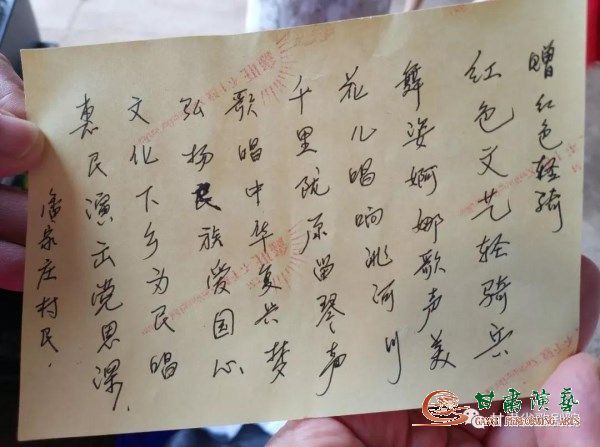 在當(dāng)日中午,小分隊(duì)的藝術(shù)家和青年演員匆匆吃了點(diǎn)簡單的午餐又投入到新添鎮(zhèn)潘家莊村的演出,場面依舊,熱情依舊,溫暖依舊!演出時(shí),演出的后臺還收到了來自潘家莊村民潘隆銘現(xiàn)場為這支下鄉(xiāng)小分隊(duì)創(chuàng)作的詩,這首詩感動(dòng)了在場的所育人,也給了全體演職人員極大的鼓舞與支持?。▓D文由甘肅省歌劇院提供)
